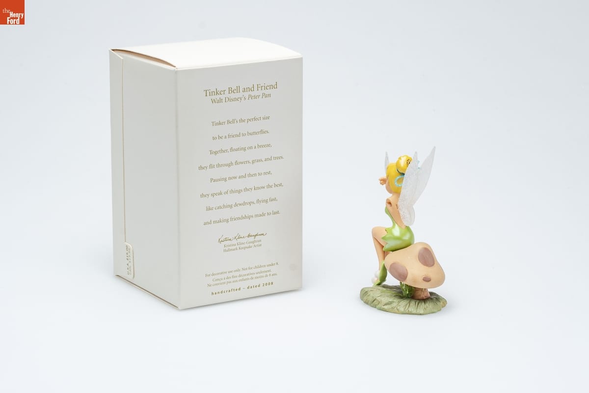 Tinker Bell and Friend / Walt Disney's Peter Pan / Tinker Bell's the perfect size / to be a friend to butterflies. / Together, floating on a breeze, / they flit through flowers, grass, and trees. / Pausing now and then to rest, / they speak of things they know the best, / like catching dewdrops, flying fast, / and making friendships made to last. / Kristina Kline-Gaughran / Hallmark Keepsake Artist / For decorative use only. Not for children under 8. / Concu a des fin decoratives seulement. / Ne convient pas aux enfants de moins de 8 ans. / handcrafted - dated 2008