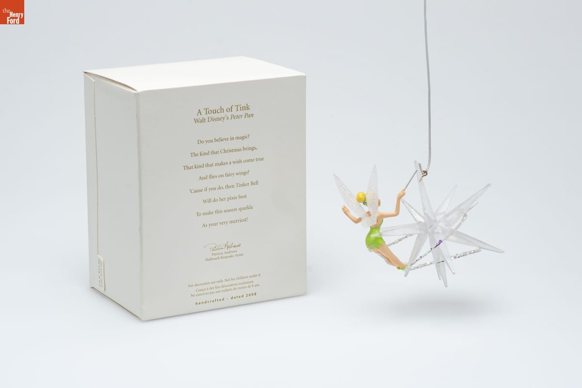 A Touch of Tink / Walt Disney's Peter Pan / Do you believe in magic? / The kind that Christmas brings, / That kind that makes a wish come true / And flies on fairy wings? / 'Cause if you do, then Tinker Bell / Will do her pixie best / To make this season sparkle / As your very merriest! / Patricia Andrews / Hallmark Keepsake Artist / For decorative use only. Not for children under 8. / Concu a des fin decoratives seulement. / Ne convient pas aux enfants de moins de 8 ans. / handcrafted - dated 2008