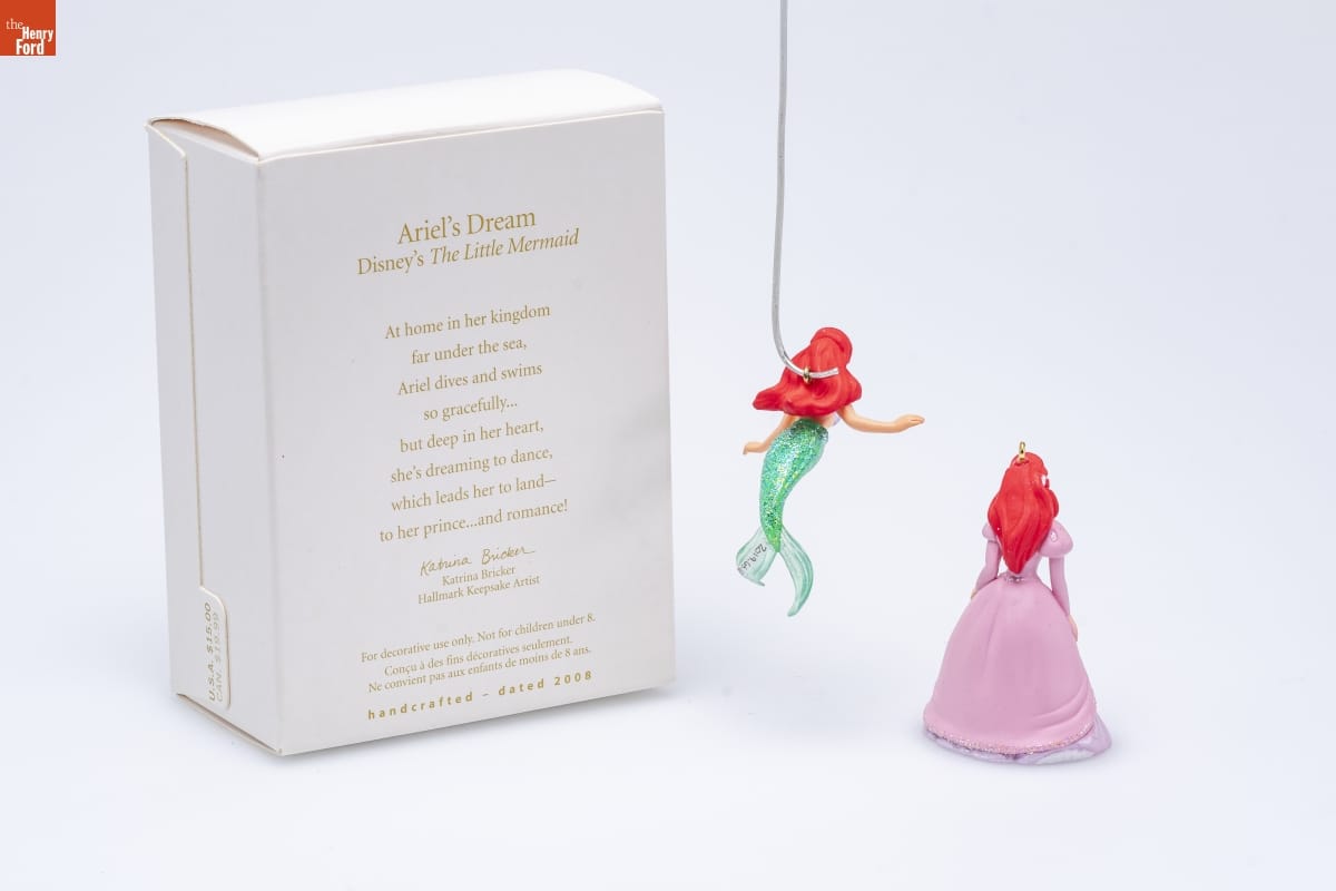 Ariel's Dream / Disney's The Little Mermaid / At home in her kingdom / far under the sea, / Ariel dives and swims / so gracefully... / but deep in her heart, / she's dreaming to dance, / which leads her to land-- / to her prince...and romance! / Katrina Bricker / Hallmark Keepsake Artist / For decorative use only. Not for children under 8. / Concu a des fins decoratives seulement. / Ne convient pas aux enfants de moins de 8 ans. / handcrafted - dated 2008