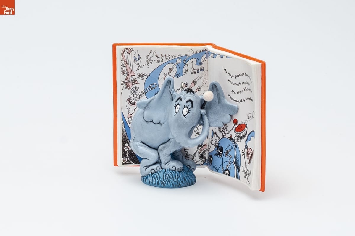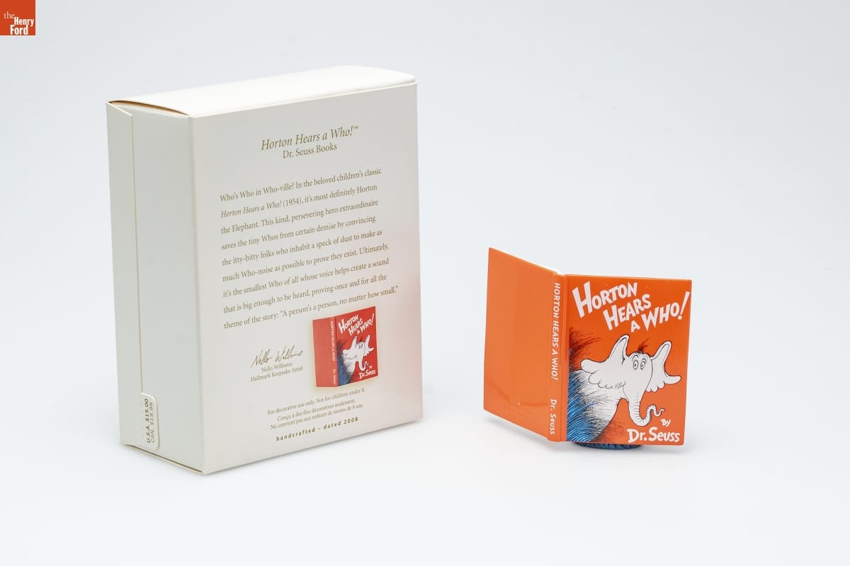 Horton Hears a Who! TM / Dr. Seuss Books / Who's Who in Who-ville? In the beloved children's classic / Horton Hears a Who! (1954), it's most definitely Horton / the Elephant. This kind, perservering hero extraordinaire / saves the tiny Whos from certain demise by convincing / the itty-bitty folks who inhabit a speck of dust to make as / much Who-noise as possible to prove they exist. Ultimately, / it's the smallest Who of all whose voice helps create a sound / that is big enough to be heard, proving once and for all the / theme of the story: "A person's a person, no matter how small." / Nello Williams / Hallmark Keepsake Artist / For decorative use only. Not for children under 8. / Concue a des fins decoratives seulement. / Ne convient pas aux enfants de moins de 8 ans. / handcrafted - dated 2008