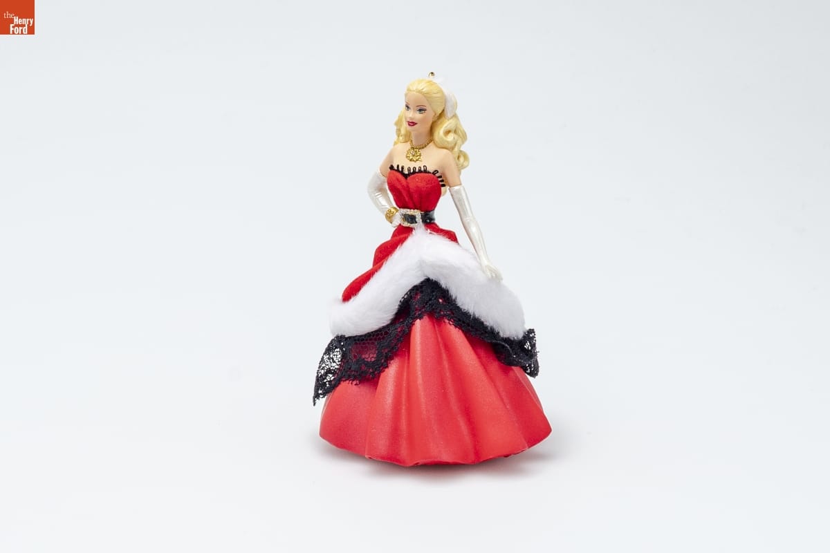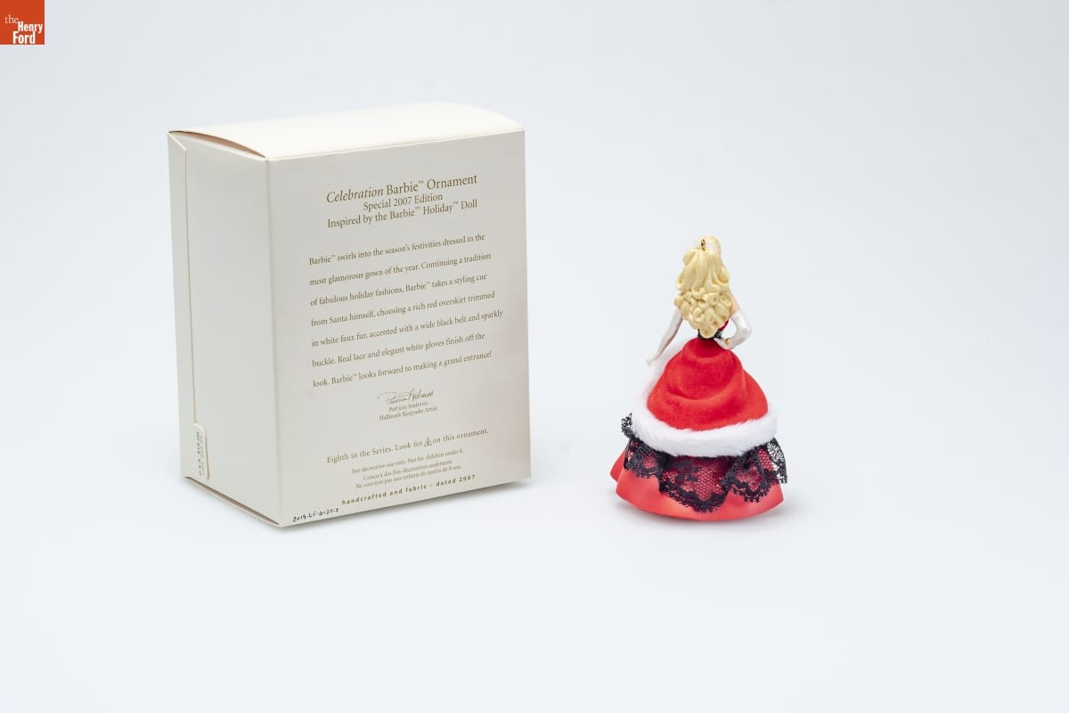 Celebration Barbie [TM] Ornament / Special 2007 Edition / Inspired by the Barbie [TM] Holiday [TM] Doll / Barbie [TM] swirls into the season's festivities dressed in the / most glamorous gown of the year. Continuing a tradition / of fabulous holiday fashions, Barbie [TM] takes a styling cue / from Santa himself, choosing a rich red overskirt trimmed / in white faux fur, accented with a wide black belt and sparkly / buckle. Real lace and elegant white gloves finish off the / look. Barbie [TM] looks forward to making a grand entrance! / Patricia Andrews / Hallmark Keepsake Artist / Eighth in the Series. Look for 8 on this ornament. / For decorative use only. Not for children under 8. / Concu a des fins decoratives seulement. / Ne convient pas aux enfants de moins de 8 ans. / handcrafted and fabric - dated 2007