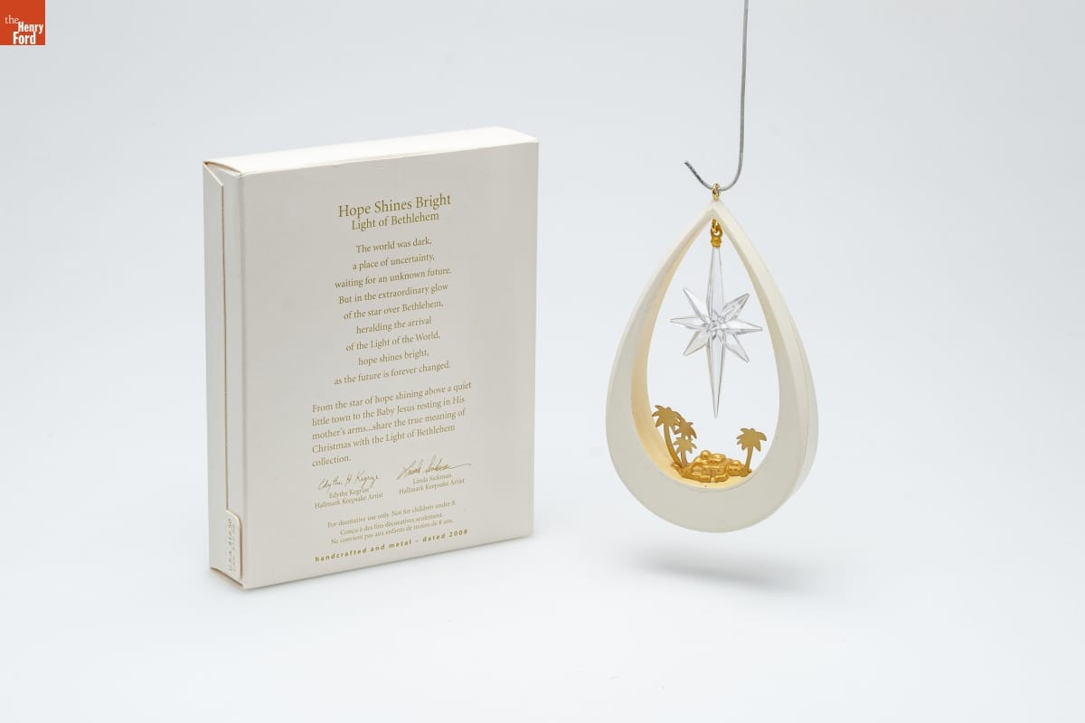 Hope Shines Bright / Light of Bethlehem / The world was dark, / a place of uncertainty, / waiting for an unknown future. / But in the extraordinary glow / of the star over Bethlehem, / heralding the arrival / of the Light of the World, / hope shines bright, / as the future is forever changed. / From the star of hope shining above a quiet / little town to the Baby Jesus resting in His / mother's arms...share the true meaning of / Christmas with the Light of Bethlehem / collection. / Edythe Kegrize / Hallmark Keepsake Artist / Linda Sickman / Hallmark Keepsake Artist / For decorative use only. Not for children under 8. / Concu a des fins decoratives seulement. / Ne convient pas aux enfants de moins de 8 ans. / handcrafted and metal - dated 2008