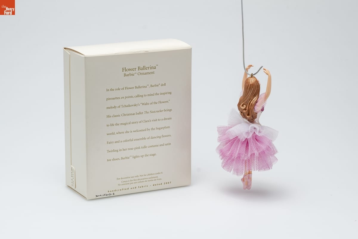 Flower Ballerina [TM] / Barbie [TM] Ornament / In the role of Flower Ballerina [TM], Barbie [R] doll / pirouettes en pointe, calling to mind the inspiring / melody of Tchaikovsky's "Waltz of the Flowers." / His classic Christmas ballet The Nutcracker brings / to life the magical story of Clara's visit to a dream / world, where she is welcomed by the Sugarplum / Fairy and a colorful ensemble of dancing flowers. / Twirling in her rose-pink tulle costume and satin / toe shoes, Barbie [TM] lights up the stage. / For decorative use only. Not for children under 8. / Concu a des fins decoratives seulement. / Ne convient pas aux enfants de moins de 8 ans. / handcrafted and fabric - dated 2007