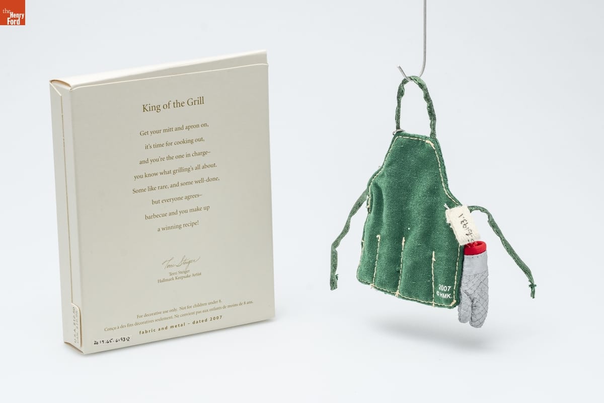 King of the Grill / Get your mitt and apron on, / it's time for cooking out, / and you're the one in charge-- / you know what grilling's all about. / Some like it rare, and some well-done, / but everyone agrees-- / barbecue and you make up / a winning recipe! / Terri Steiger / Hallmark Keepsake Artist / For decorative use only. Not for children under 8. / Concu a des fins decoratives seulement. Ne convient pas aux enfants de moins de 8 ans. / fabric and metal - dated 2007