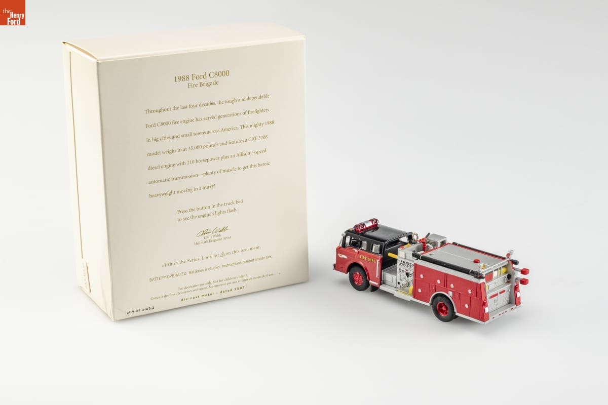 1988 Ford C8000 / Fire Brigade / Throughout the last four decades, the tough and dependable / Ford C8000 fire engine has served generations of firefighters / in big cities and small towns across America. This mighty 1988 / model weighs in at 35,000 pounds and features a CAT 3208 / diesel engine with 210 horsepower plus an Allison 5-speed / automatic transmission--plenty of muscle to get this heroic / heavyweight moving in a hurry! / Press the button in the truck bed / to see the engine's lights flash. / Chris Webb / Hallmark Keepsake Artist / Fifth in the Series. Look for 5 on this ornament. / BATTERY-OPERATED. Batteries included. Instructions printed inside box. / For decorative use only. Not for children under 8. / Concu a des fins decoratives seulement. Ne convient pas aux enfants de moins de 8 ans. / die-cast metal - dated 2007