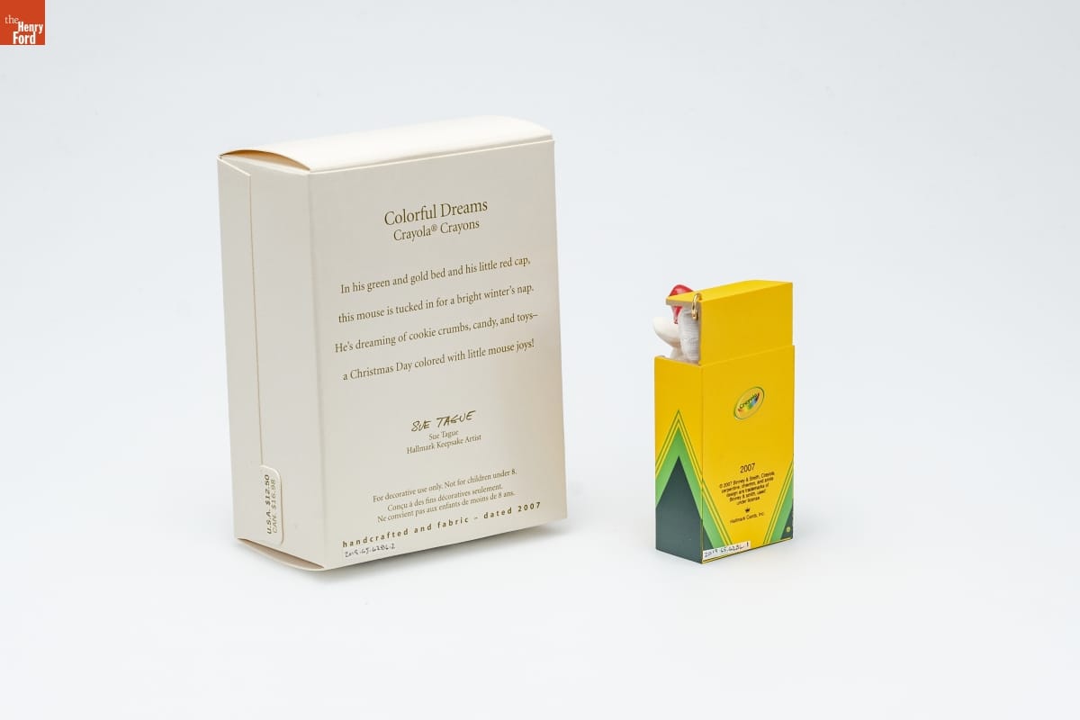 Colorful Dreams / Crayola [R] Crayons / In his green and gold bed and his little red cap, / this mouse is tucked in for a bright winter's nap. / He's dreaming of cookie crumbs, candy, and toys-- / a Christmas Day colored with little mouse joys! / Sue Tague / Hallmark Keepsake Artist / For decorative use only. Not for children under 8. / Concu a des fins decoratives seulement. / Ne convient pas aux enfants de moins de 8 ans. / handcrafted and fabric - dated 2007