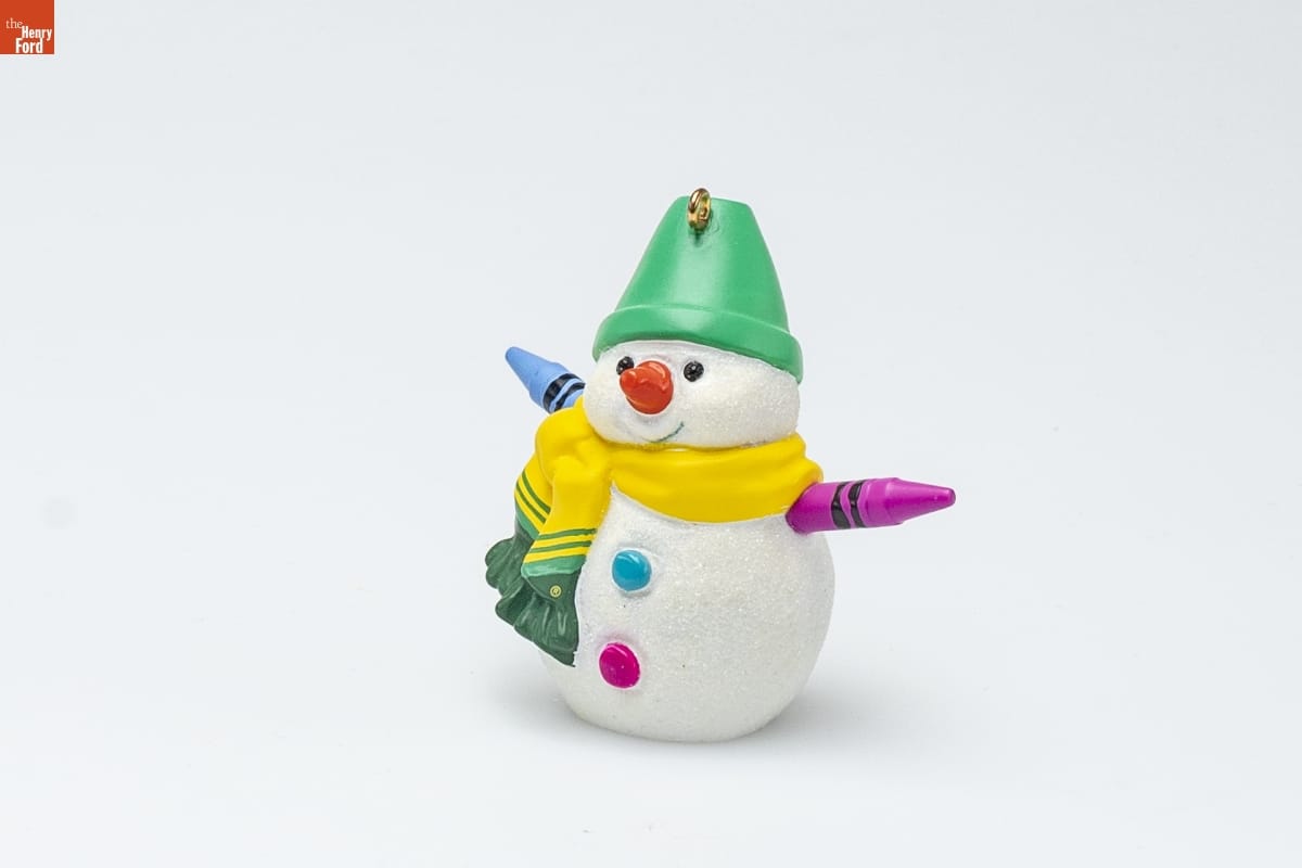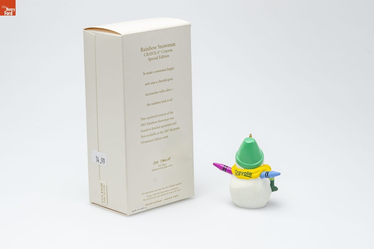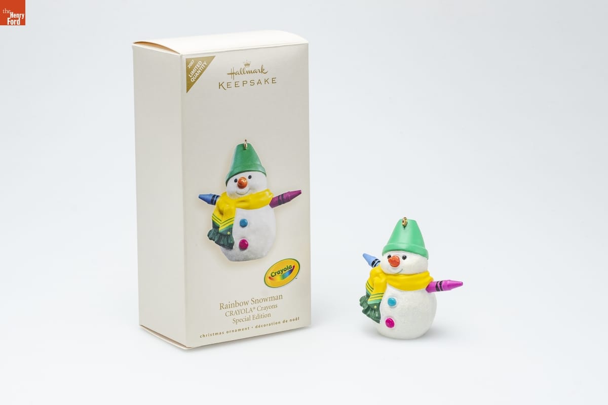 ornament: Crayola [R] [TM] ornament, underside: 2007 / (C) 2007 B & S / [TM] / Hallmark Cards, Inc. packaging, front: [TM] / Hallmark / KEEPSAKE / Crayola [TM] / Rainbow Snowman / CRAYOLA [R] Crayons / Special Edition / christmas ornament - decoration de noel packaging, back: Rainbow Snowman / CRAYOLA [R] Crayons / Special Edition / To make a snowman happy / and coax a cheerful grin, / Accessorize with color-- / the rainbow look is in! / This repainted version of the / 2002 Rainbow Snowman was / issued in limited quantities and / first available at the 2007 Keepsake / Ornament Debut event. / Sue Tague / Hallmark Keepsake Artist / For decorative use only. Not for children under 8. / Concu a des fins decoratives seulement. / Ne convient pas aux enfants de moins de 8 ans. / handcrafted - dated 2007 packaging, underside: (C) 2007 Crayola, Crayola [TM], Chevron [TM], Serpentine [TM], Oval Smile Design [TM] / are trademarks of Crayola used under license. / www.crayola.com / (C) 2007 Hallmark Licensing, Inc. / Mfd. for/Fabrique pour Hallmark Cards, Inc. / Kansas City, MO 64141 / Made in China QXE9117