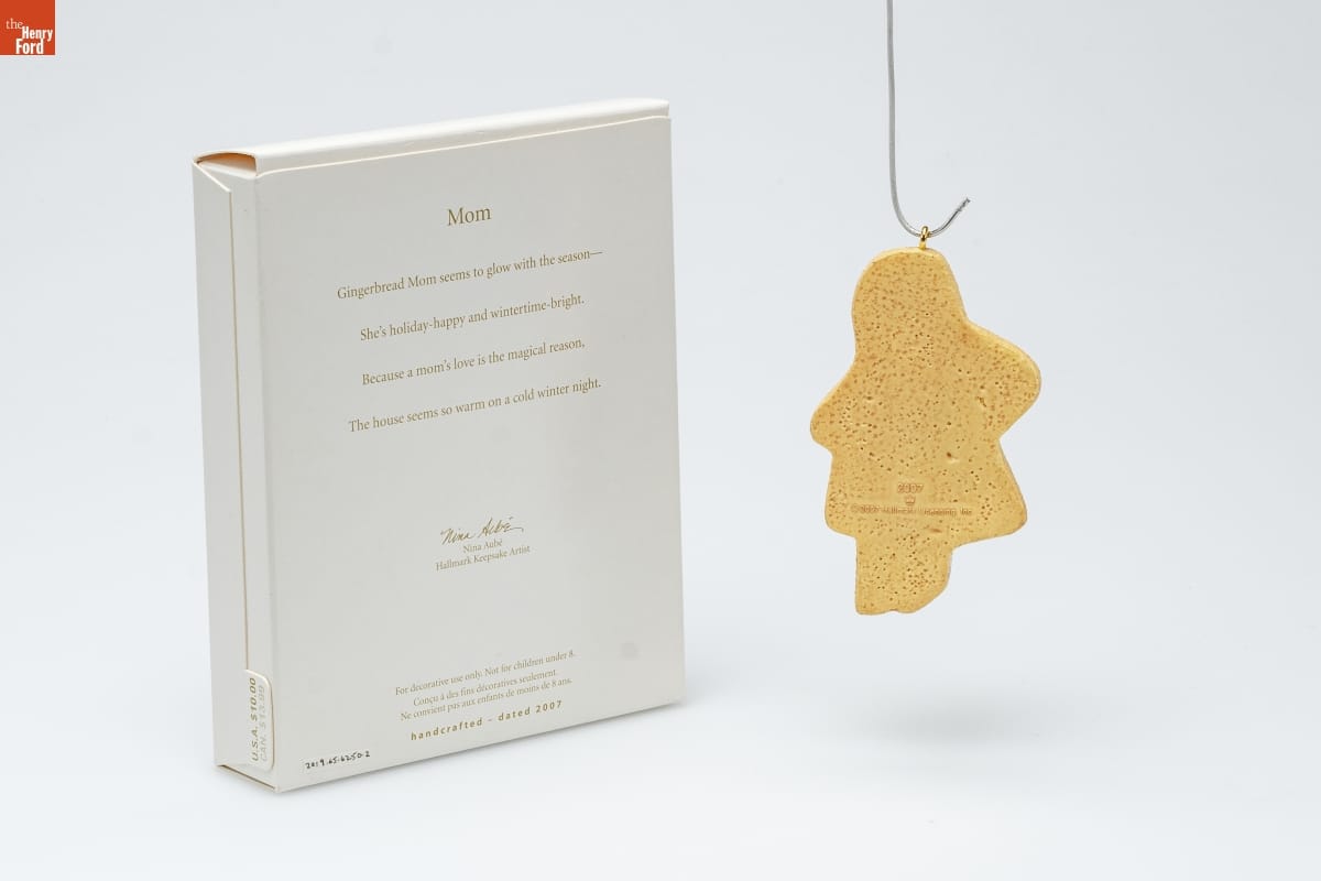 Mom / Gingerbread Mom seems to glow with the season-- / She's holiday happy and wintertime-bright. / Because a mom's love is the magical reason, / The house seems so warm on a cold winter night. / Nina Aube / Hallmark Keepsake Artist / For decorative use only. Not for children under 8. / Concu a des fins decoratives seulement. / Ne convient pas aux enfants de moins de 8 ans. / handcrafted - dated 2007