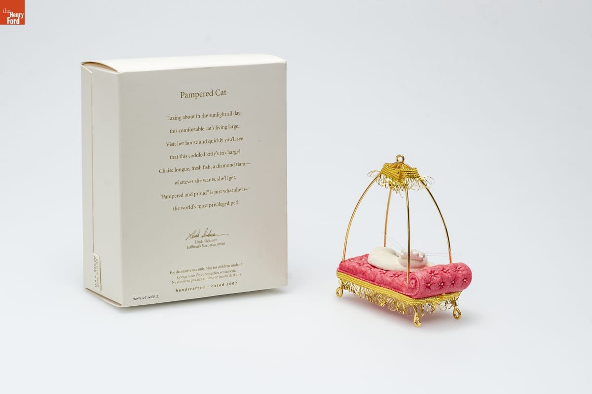 Pampered Cat / Lazing about in the sun all day, / this comfortable cat's living large. / Visit her house and quickly you'll see / that this coddled kitty's in charge! / Chaise longue, fresh fish, a diamond tiara-- / whatever she wants, she'll get. / "Pampered and proud" is just what she is-- / the world's most privileged pet! / Linda Sickman / Hallmark Keepsake Artist / For decorative use only. Not for children under 8. / Concu a des fins decoratives seulement. / Ne convient pas aux enfants de moins de 8 ans. / handcrafted - dated 2007