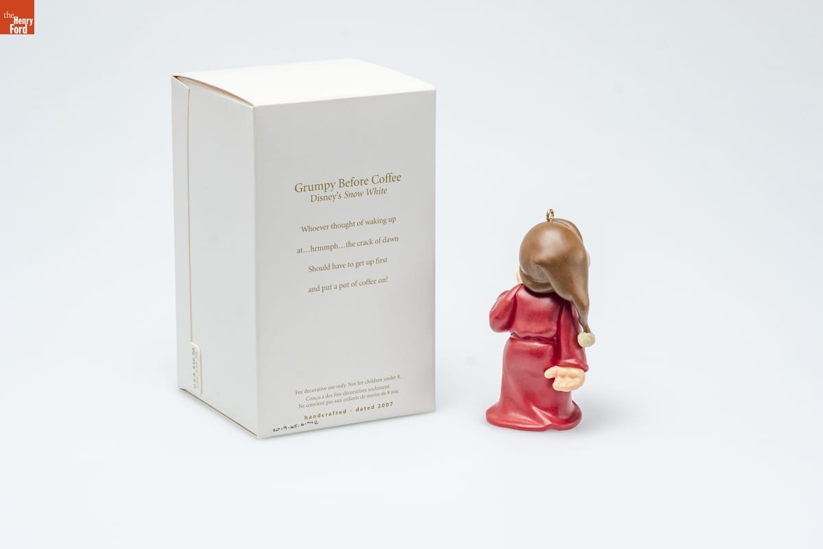 Grumpy Before Coffee / Disney's Snow White / Whoever thought of waking up / at...hrmmph...the crack of dawn / Should have to get up first / and put a pot of coffee on! / For decorative use only. Not for children under 8. / Concu a des fins decoratives seulement. / Ne convient pas aux enfants de moins de 8 ans. / handcrafted - dated 2007