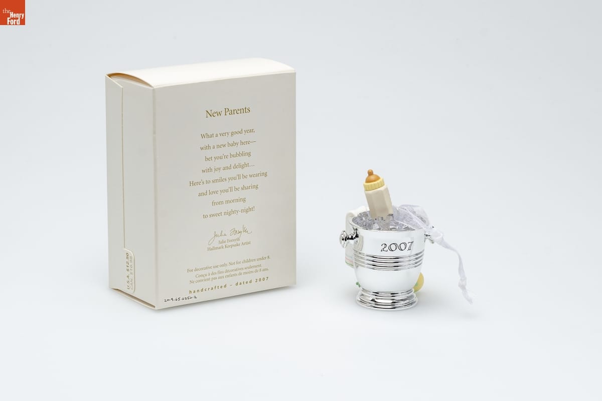 New Parents / What a very good year, / with a new baby here-- / bet you're bubbling / with joy and delight... / Here's to smiles you'll be wearing / and love you'll be sharing / from morning / to sweet nighty-night! / Julie Forsyth / Hallmark Keepsake Artist / For decorative use only. Not for children under 8. / Concu a des fins decoratives seulement. / Ne convient pas aux enfants de moins de 8 ans. / handcrafted - dated 2007