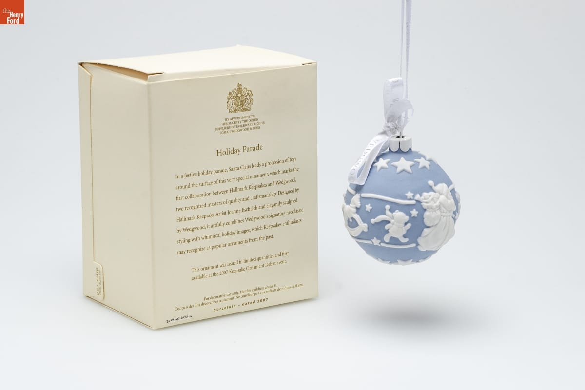 BY APPOINTMENT TO / HER MAJESTY THE QUEEN / SUPPLIERS OF TABLEWARE & GIFTS / JOSIAH WEDGWOOD AND SONS / Holiday Parade / In a festive holiday parade, Santa Claus leads a procession of toys / around the surface of this very special ornament, which marks the / first collaboration between Hallmark Keepsakes and Wedgwood, / two recognized masters of quality and craftsmanship. Designed by / Hallmark Keepsake Artist Joanne Eschrich and elegantly sculpted / by Wedgwood, it artfully combines Wedgwood's signature neoclassic / styling with whimsical holiday images, which Keepsake enthusiasts / may recognize as popular ornaments from the past. / This ornament was issued in limited quantities and first / available at the 2007 Keepsake Ornament Debut event. / For decorative use only. Not for children under 8. / Concu a des fins decoratives seulement. / Ne convient pas aux enfants de moins de 8 ans. / porcelain - dated 2007