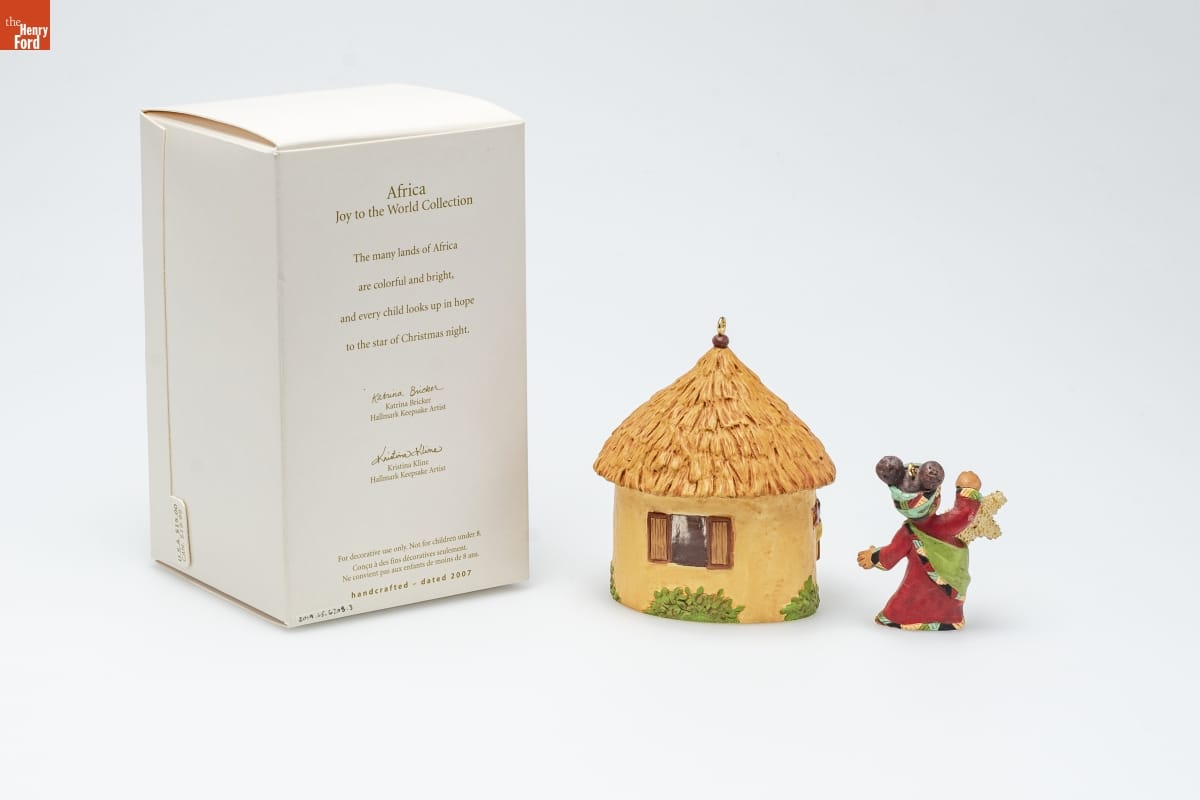 Africa / Joy to the World Collection / The many lands of Africa / are colorful and bright, / and every child looks up in hope / to the star of Christmas night. / Katrina Bricker / Hallmark Keepsake Artist / Kristina Kline / Hallmark Keepsake Artist / For decorative use only. Not for children under 8. / Concu a des fins decoratives seulement. / Ne convient pas aux enfants de moins de 8 ans. / handcrafted - dated 2007