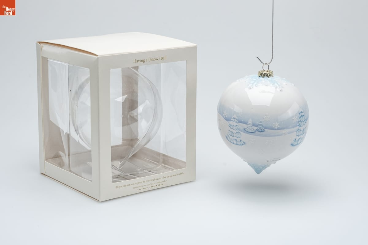 Having a (Snow) Ball / This ornament was inspired by favorite characters first introduced in 2001. / For decorative use only. Not for children under 8. / ceramic - dated 2008