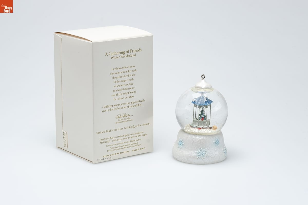 A Gathering of Friends / Winter Wonderland / In winter, when Nature / slows down from her rush, / she gathers her friends / in the magical hush / of wonders as deep / as a fresh-fallen snow / and all the bright beauty / the season can show. / A different wintry scene has appeared each / year in this festive series of snow globes. / LaDene Votruba / Hallmark Keepsake Artist / Sixth and Final in the Series. Look for 6 on this ornament. / CAUTION: Globe is made of glass and is breakable. / ATTENTION: Cette boule d'eau en verre est tres fragile. / For decorative use only. Not for children under 8. / Concu a des fins decoratives seulement. / Ne convient pas aux enfants de moins de 8 ans. / glass and handcrafted - dated 2007