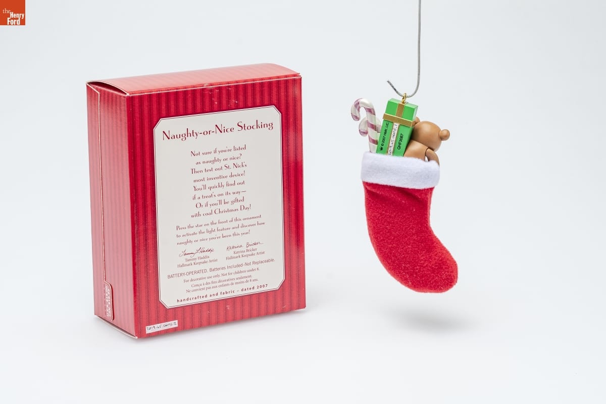 ornament: Santa's / Favorite / NICE / A Little / Bit of Both / Naughty / LUMP / OF COAL ornament, back: [TM] / (C) 2007 HMK. LIC. / QHF3087 packaging, front: [TM] / Hallmark / KEEPSAKE / Magic / Features Light / Naughty-or-Nice Stocking / christmas ornament - decoration de noel packaging, back: Naughty-or-Nice Stocking / Not sure if you're listed / as naughty of nice? / Then test out St. Nick's / most inventive device! / You'll quickly find out / if a treat's on its way-- / Or if you'll be gifted / with coal Christmas Day! / Press the star on the front of this ornament / to activate the light features and discover how / naughty or nice you've been this year! / Tammy Haddix / Hallmark Keepsake Artist / Katrina Bricker / Hallmark Keepsake Artist / For decorative use only. Not for children under 8. / Concu a des fins decoratives seulement. / Ne convient pas aux enfants de moins de 8 ans. / handcrafted and fabric - dated 2007 packaging, underside: (C) 2007 Hallmark Licensing, Inc. / Mfd. for/Fabrique pour Hallmark Cards, Inc. / Kansas City, MO 64141 / Made in China QHF3087