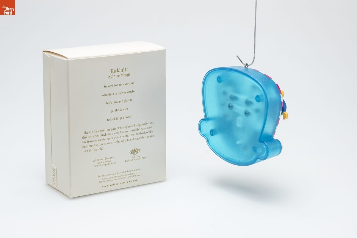 Kickin' It / Spin-A-Majigs / Soccer's fun for everyone / who likes to play or watch-- / both fans and players / get the chance / to kick it up a notch! / Take me for a spin! As part of the Spin-A-Majigs collection, / this ornament includes a cool feature--turn the handle on / the front to see the scene come to life. Even the back of the / ornament is fun to watch--the wheels and cogs whirl as you / turn the handle! / Katrina Bricker / Hallmark Keepsake Artist / Ken Crow / Hallmark Keepsake Artist / For decorative use only. Not for children under 8. / Concu a des fins decoratives seulement. / Ne convient pas aux enfants de moins de 8 ans. / handcrafted - dated 2008