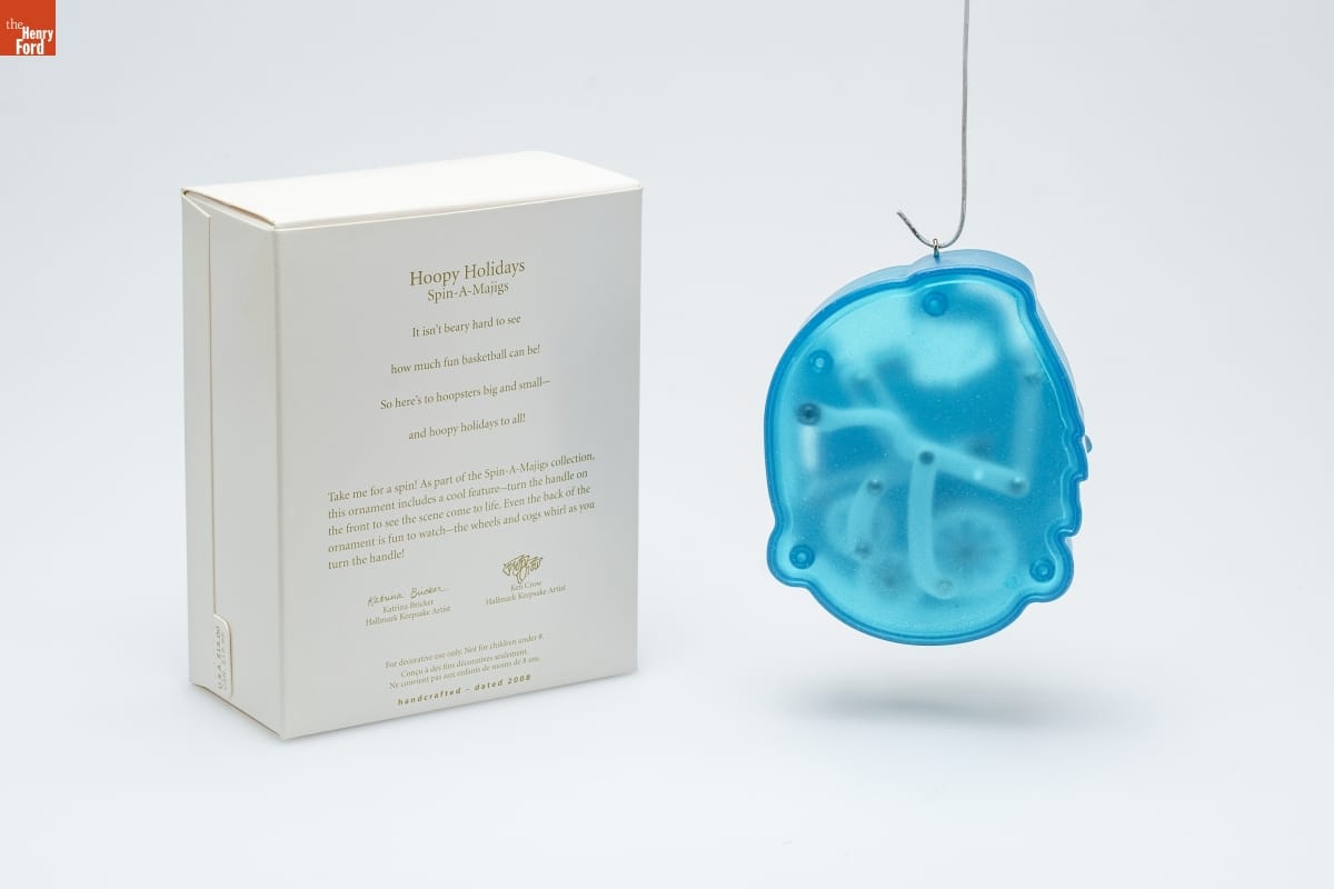 Hoopy Holidays / Spin-A-Majigs / It isn't beary hard to see / how much fun basketball can be! / So here's to hoopsters big and small-- / and hoopy holidays to all! / Take me for a spin! As part of the Spin-A-Majigs collection, / this ornament includes a cool feature--turn the handle on / the front to see the scene come to life. Even the back of the / ornament is fun to watch--the wheels and cogs whirl as you / turn the handle! / Katrina Bricker / Hallmark Keepsake Artist / Ken Crow / Hallmark Keepsake Artist / For decorative use only. Not for children under 8. / Concu a des fins decoratives seulement. / Ne convient pas aux enfants de moins de 8 ans. / handcrafted - dated 2008