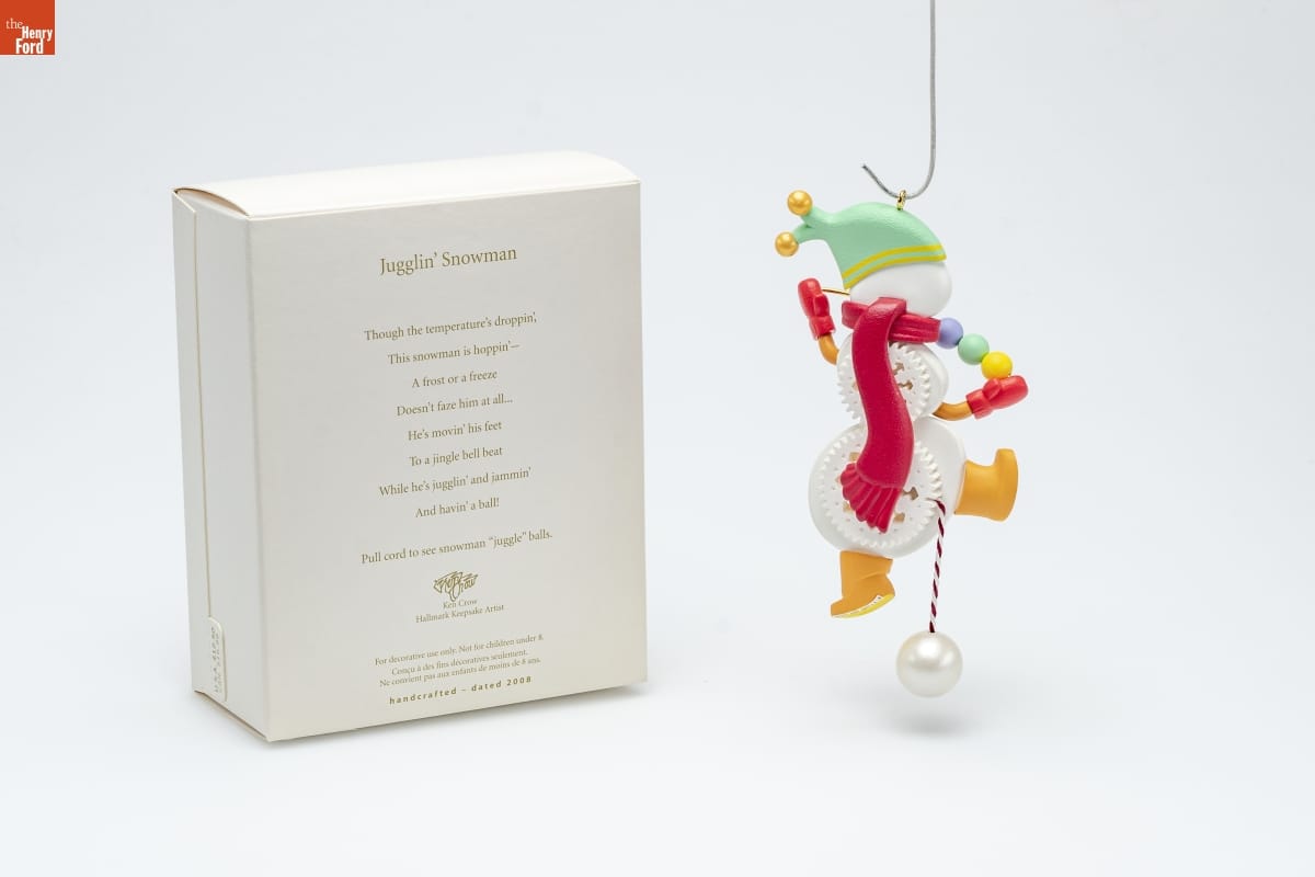 Jugglin' Snowman / Though the temperature's droppin', / This snowman is hoppin'-- / A frost or a freeze / Doesn't faze him at all... / He's movin' his feet / To a jingle bell beat / While he's jugglin' and jammin' / And havin' a ball! / Pull cord to see snowman "juggle" balls. / Ken Crow / Hallmark Keepsake Artist / For decorative use only. Not for children under 8. / Concu a des fins decoratives seulement. / Ne convient pas aux enfants de moins de 8 ans. / handcrafted - dated 2008