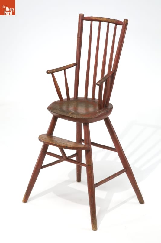 This Windsor highchair allowed a child to sit at the same level as the dining table making it easier for parents to feed the child. Highchairs, however, were not a common piece of household furniture in the early 1800s. Most small children had to sit on someone's lap or find other ways to boost themselves to table level during meals.