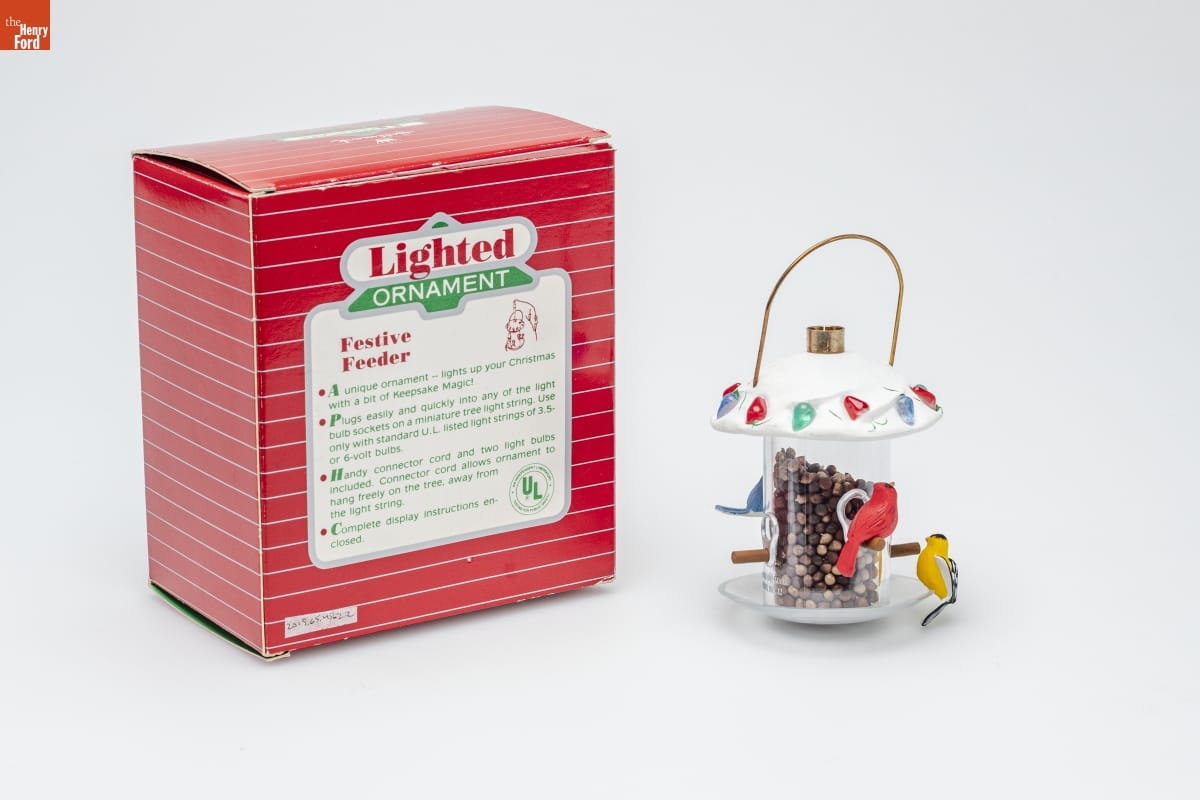 Lighted / ORNAMENT / Festive / Feeder / A unique ornament - lights up your Christmas / with a bit of Keepsake Magic! / Plugs easily and quickly into any of the light / bulb sockets on a miniature tree light string. Use / only with standard U.L. listed light strings 3.5- / or 6-volt bulbs. / Handy connector cord and two light bulbs / included. Connector cord allows ornament to / hang freely on the tree, away from / the light string. / Complete display instructions en- / closed.