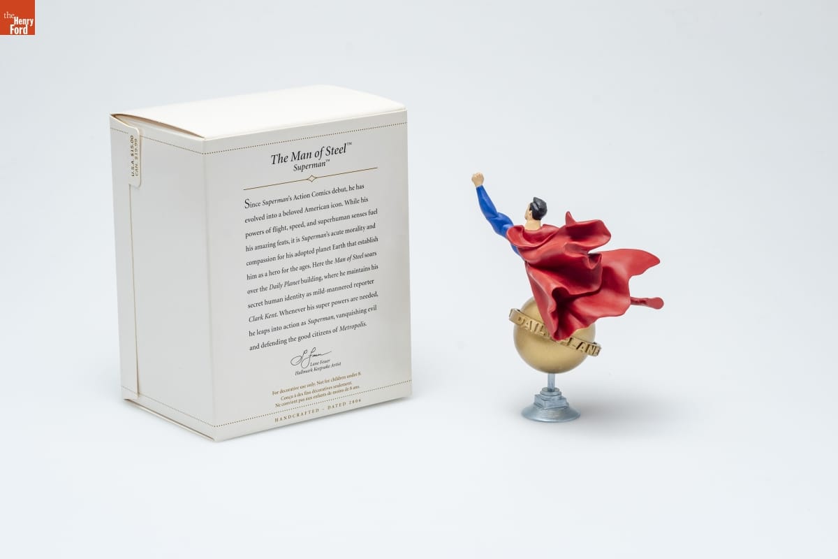 The Man of Steel TM / Superman TM / Since Superman's Action Comics debut, he has / evolved into a beloved American icon. While his / powers of flight, speed, and superhuman senses fuel / his amazing feats, it is Superman's acute morality and / compassion for his adopted planet Earth that establish / him as a hero for the ages. Here the Man of Steel soars / over the Daily Planet building, where he maintains his / secret human identity as mild-mannered reporter / Clark Kent. Whenever his super powers are needed, / he leaps into action as Superman, vanquishing evil / and defending the good citizens of Metropolis. / Lane Feuer / Hallmark Keepsake Artist / For decorative use only. Not for children under 8. / Concu a des fins decoratives seulement. Ne convient pas aux enfants de moins de 8 ans. / HANDCRAFTED - DATED 2006