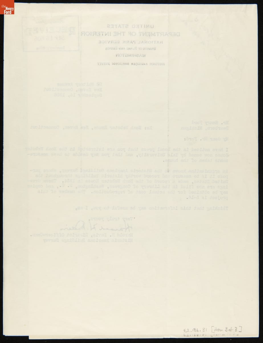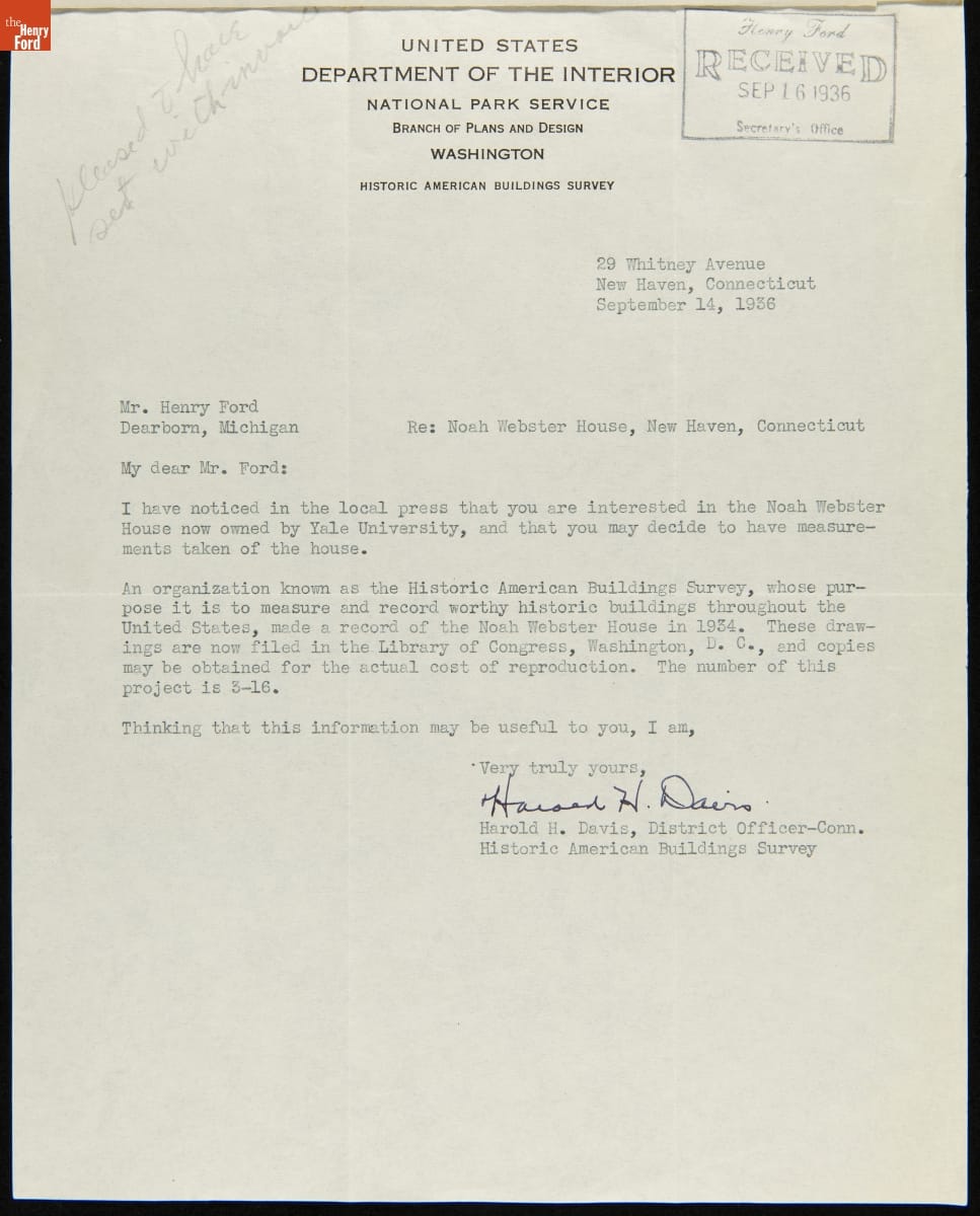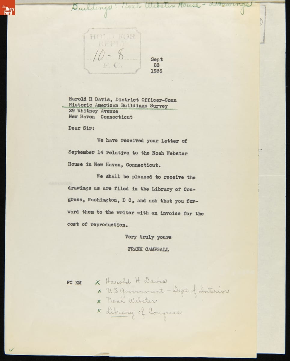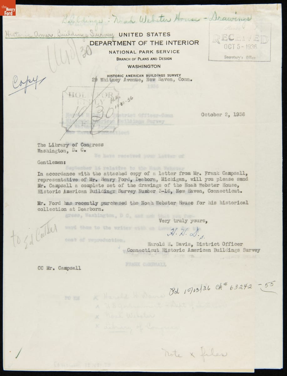Correspondence regarding Noah Webster Home and the Historic American Buildings Survey, September-October 1936