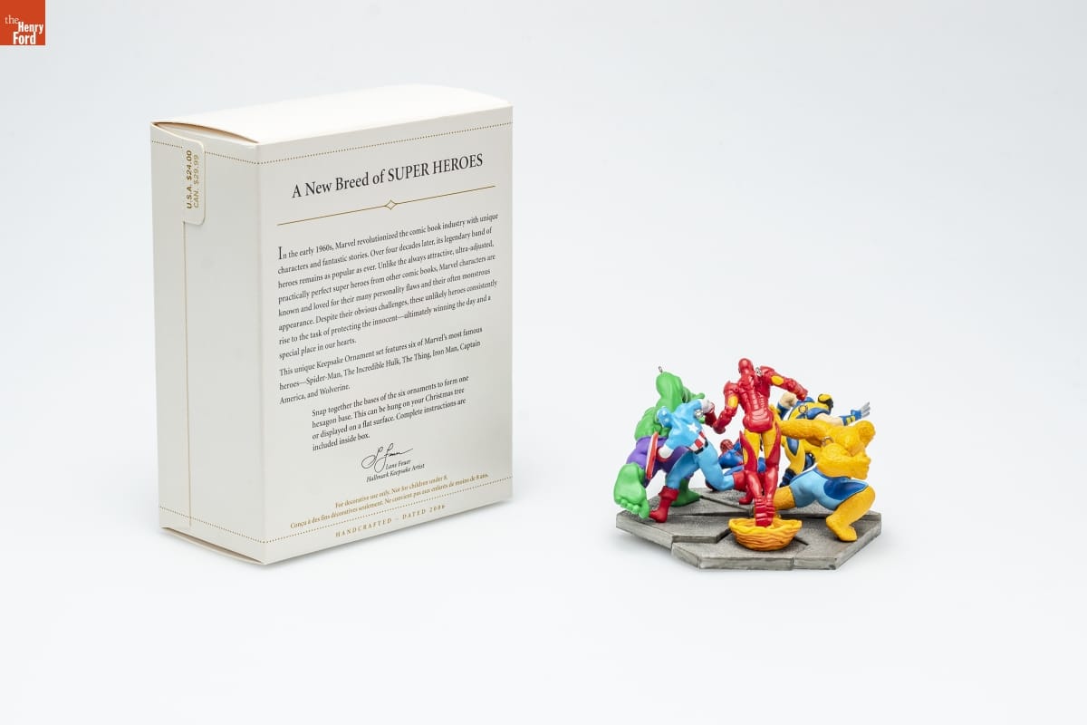 A New Breed of SUPER HEROES / In the early 1960s, Marvel revolutionized the comic book industry with unique / characters and fantastic stories. Over four decades later, its legendary band of / heroes remains as popular as ever. Unlike the always attractive, ultra-adjusted, / practically perfect super heroes from other comic books, Marvel characters are / known and loved for their many personality flaws and their often monstrous / appearance. Despite their obvious challenges, these unlikely heroes consistently / rise to the task of protecting the innocent--ultimately winning the day and a / special place in our hearts. / This unique Keepsake Ornament set features six of Marvel's most famous / heroes--Spider-Man, The Incredible Hulk, The Thing, Iron Man, Captain / America, and Wolverine. / Snap together the bases of the six ornaments to form one / hexagon base. This can be hung on your Christmas tree / or displayed on a flat surface. Complete instructions are / included inside box. / Lane Feuer / Hallmark Keepsake Artist / For decorative use only. Not for children under 8. / Concu a des fins decoratives seulement. Ne convient pas aux enfants de moins de 8 ans. / HANDCRAFTED - DATED 2006