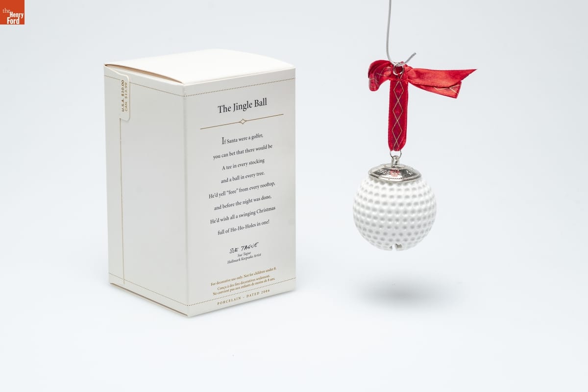 The Jingle Ball / If Santa were a golfer, / you can bet that there would be / A tee in every stocking / and a ball in every tree. / He'd yell "fore" from every rooftop, / and before the night was done, / He's wish all a swinging Christmas / full of Ho-Ho-Holes in one! / Sue Tague / Hallmark Keepsake Artist / For decorative use only. Not for children under 8. / Concu a des fins decoratives seulement. Ne convient pas aux enfants de moins de 8 ans. / PORCELAIN - DATED 2006