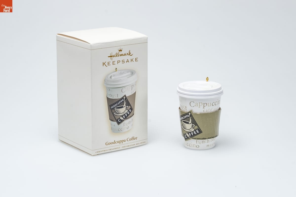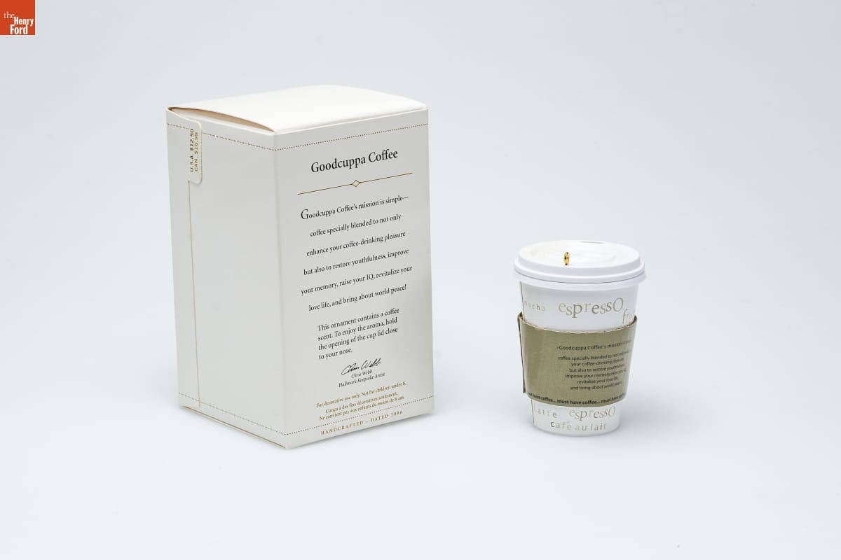 Goodcuppa Coffee / Goodcuppa Coffee's mission is simple-- / coffee specially blended to not only / enhance your coffee-drinking pleasure / but also to restore youthfulness, improve / your memory, raise your IQ, revitalize your / love life, and bring about world peace! / This ornament contains a coffee / scent. To enjoy the aroma, hold / the opening of the cup lid close / to your nose. / Chris Webb / Hallmark Keepsake Artist / For decorative use only. Not for children under 8. / Concu a des fins decoratives seulement. / Ne convient pas aux enfants de moins de 8 ans. / HANDCRAFTED - DATED 2006