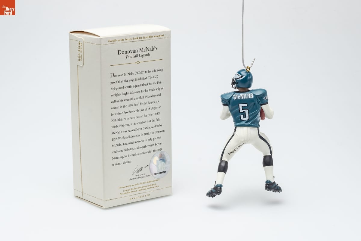 Twelfth in the Series. Look for 12 on this ornament. / Donovan McNabb / Football Legends / Donovan McNabb ("DM5" to fans) is living / proof that nice guys finish first. The 6'2", / 230-pound starting quarterback for the Phil- / adelphia Eagles is known for his leadership as / well as his strength and skill. Picked second / overall in the 1999 draft by the Eagles, the / four-time Pro Bowler is one of 18 players in / NFL history to have passed for over 10,000 / yards. Not content to excel on just the field, / McNabb was named Most Caring Athlete by / USA Weekend Magazine in 2003. His Donovan / McNabb Foundation works to help prevent / and treat diabetes, and together with Peyton / Manning, he helped raise funds for the 2004 / tsunami victims. / NFL / Rudy Garcia / Hallmark Keepsake Artist / For decorative use only. Not for children under 8. / Concu a des fins decoratives seulement. / Ne convient pas aux enfants de moins de 8 ans. / HANDCRAFTED