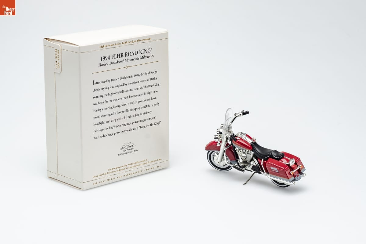 Eighth in the Series. Look for 8 on this ornament. / 1994 FLHR ROAD KING (R) / Harley-Davidson (R) Motorcycle Milestones / Introduced by Harley-Davidson in 1994, the Road King's / classic styling was inspired by those iron horses of Harley / roaming the highways half a century earlier. The Road King / was born for the modern road, however, and fit right in to / Harley's touring lineup. Sure, it looked great going down- / town, showing off a low profile, sweeping handlebars, burly / headlight, and deep-skirted fenders. But its highway / heritage--the big V-twin engine, a generous gas tank, and / hard saddlebags--proves why riders say, "Long live the King!" / Don Palmiter / Hallmark Keepsake Artist / For decorative use only. Not for children under 8. / Concu a des fins decoratives seulement. Ne convient pas aux enfants de moins de 8 ans. / DIE-CAST METAL AND HANDCRAFTED - DATED 2006