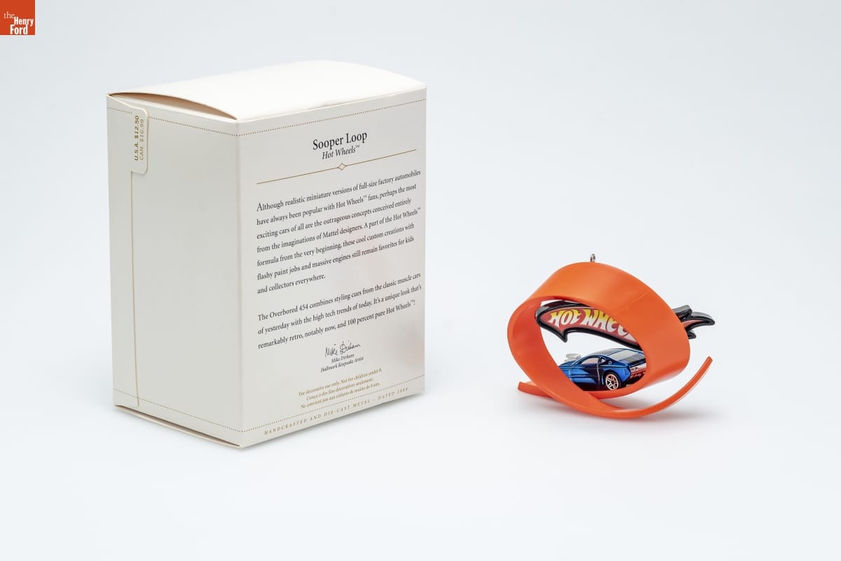 Sooper Loop / Hot Wheels TM / Although realistic miniature versions of full-size factory automobiles / have always been popular with Hot Wheels TM fans, perhaps the most / exciting cars of all are the outrageous concepts conceived entirely / from the imaginations of Mattel designers. A part of the Hot Wheels TM / formula from the very beginning, these cool custom creations with / flashy paint jobs and massive engines still remain favorites for kids / and collectors everywhere. / The Overbored 454 combines styling cues from the classic muscle cars / of yesterday with the high tech trends of today. It's a unique look that's / remarkably retro, notably now, and 100 percent pure Hot Wheels TM! / Mike Dirham / Hallmark Keepsake Artist / For decorative use only. Not for children under 8. / Concu a des fins decoratives seulement. / Ne convient pas aux enfants de moins de 8 ans. / HANDCRAFTED AND DIE-CAST METAL - DATED 2006