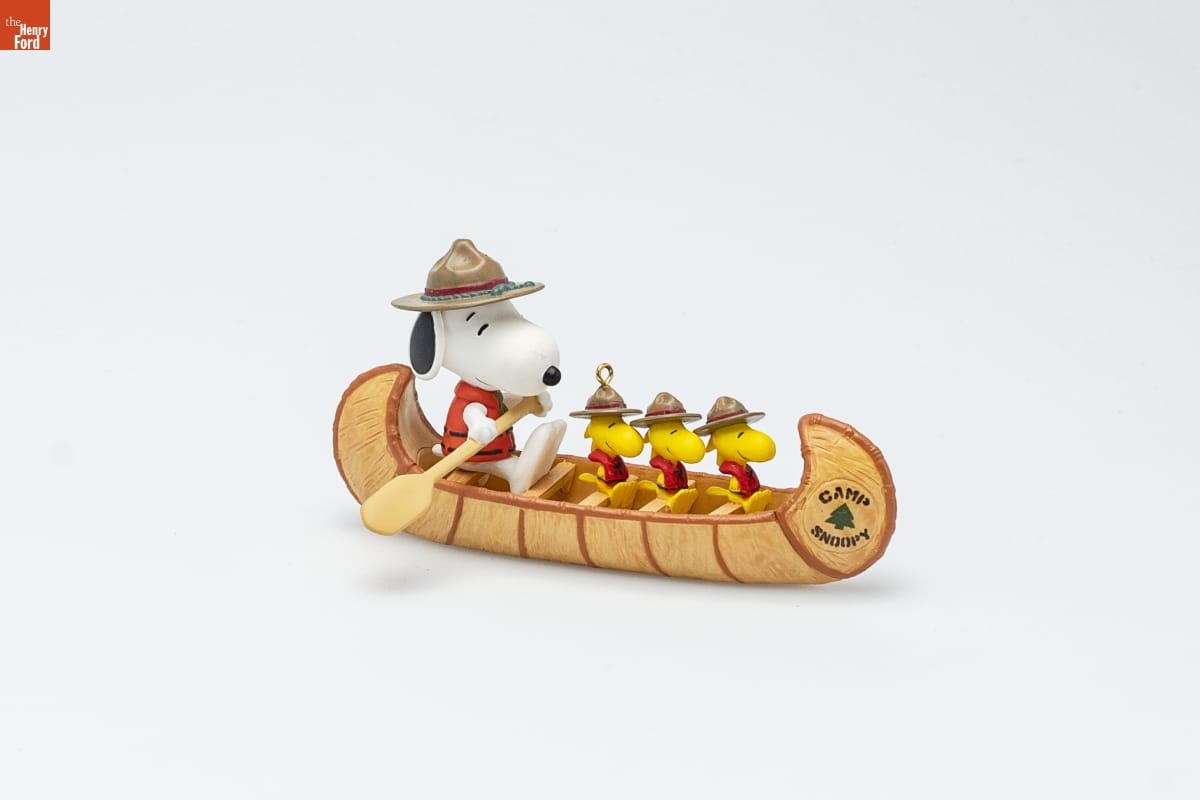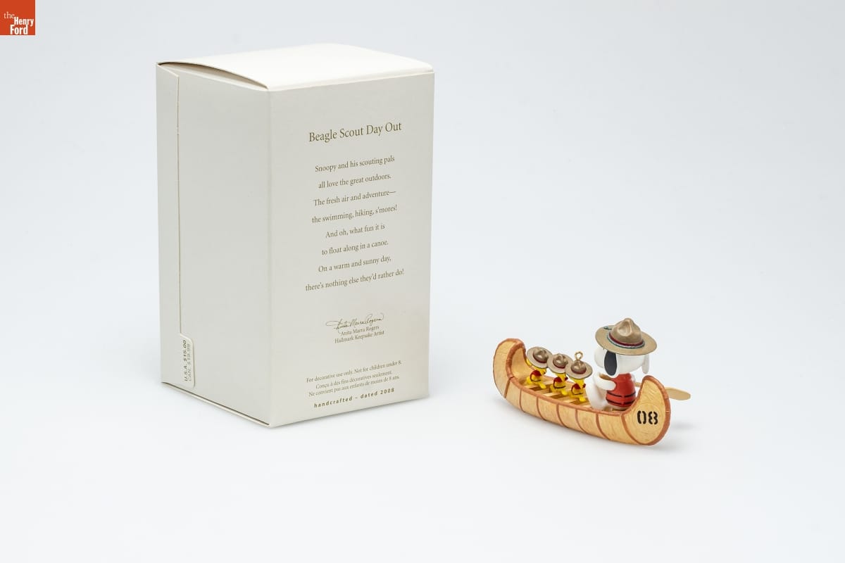 Beagle Scout Day Out / Snoopy and his scouting pals / all love the great outdoors. / The fresh air and adventure-- / the swimming, hiking, s'mores! / And oh, what fun it is / to float along in a canoe. / On a warm and sunny day, / there's nothing else they'd rather do! / Anita Marra Rogers / Hallmark Keepsake Artist / For decorative use only. Not for children under 8. / Concu a des fin decoratives seulement. / Ne convient pas aux enfants de moins de 8 ans. / handcrafted - dated 2008