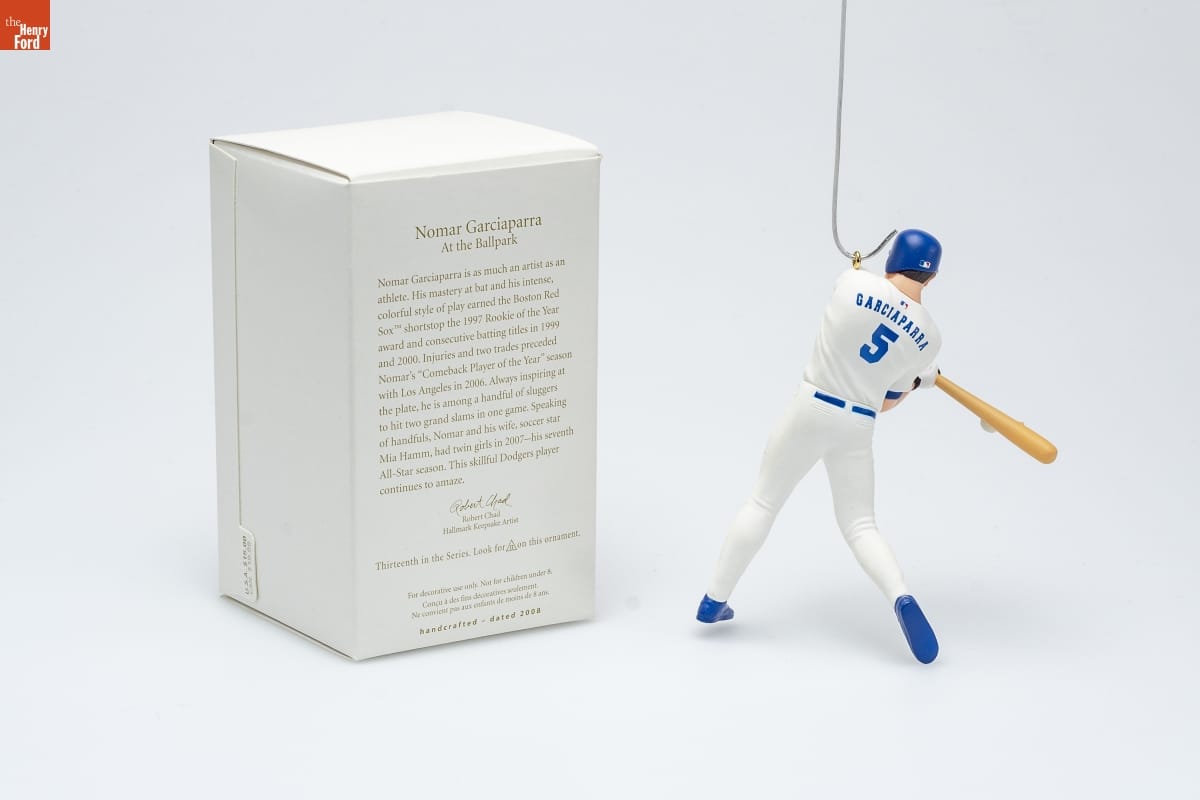 Nomar Garciaparra / At the Ballpark / Nomar Garciaparra is as much an artist is an / athlete. His mastery at bat and his intense, / colorful style of play earned the Boston Red / Sox TM shortstop the 1997 Rookie of the Year / award and consecutive batting titles in 1999 / and 2000. Injuries and two trades preceded / Nomar's "Comeback Player of the Year" season / with Los Angeles in 2006. Always inspiring at / the plate, he is among a handful of sluggers / to hit two grand slams in one game. Speaking / of handfuls, Nomar and his wife, soccer star / Mia Hamm, had twin girls in 2007--his seventh / All-Star season. This skilled Dodgers player / continues to amaze. / Robert Chad / Hallmark Keepsake Artist / Thirteenth in the Series. Look for 13 on this ornament. / For decorative use only. Not for children under 8. / Concu a des fins decoratives seulement. / Ne convient pas aux enfants de moins de 8 ans. / handcrafted - dated 2008