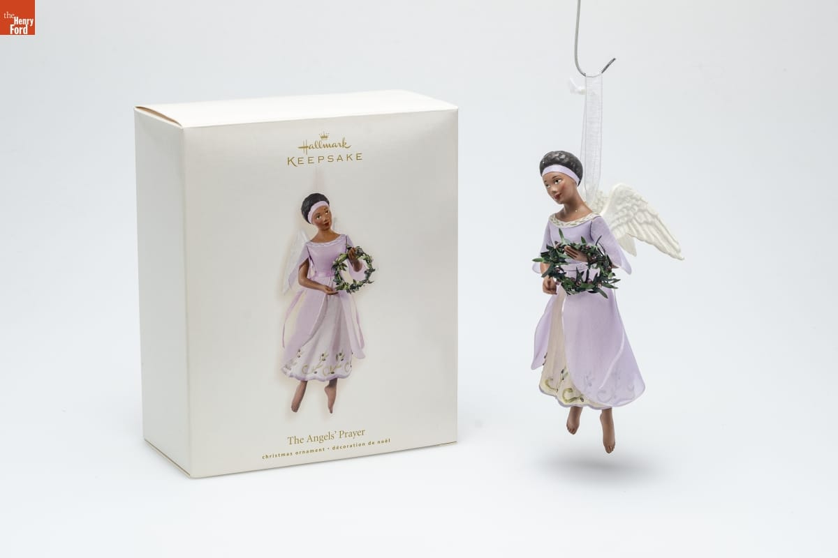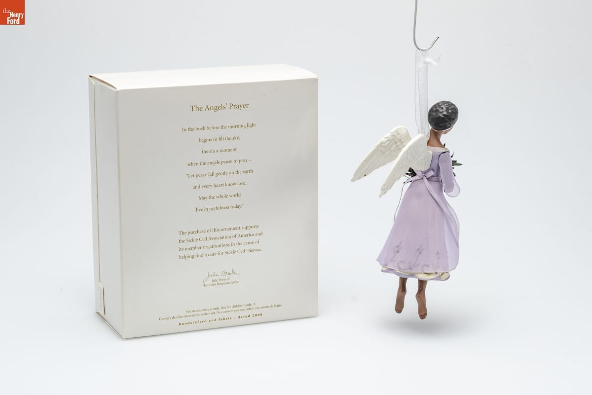 The Angels' Prayer / In the hush before the morning light / begins to fill the sky, / there's a moment / when the angels pause to pray-- / "Let peace fall gently on the earth / and every heart know love. / May the whole world / live in joyfulness today." / The purchase of this ornament supports / the Sickle Cell Association of America and / its member organizations in the cause of / helping find a cure for Sickle Cell Disease. / Julie Forsyth / Hallmark Keepsake Artist / For decorative use only. Not for children under 8. / Concu a des fins decoratives seulement. Ne convient pas aux enfants de moins de 8 ans. / handcrafted and fabric - dated 2008