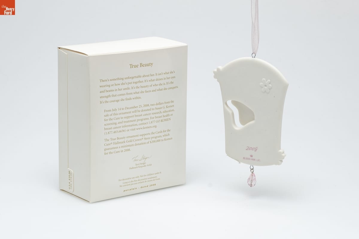 True Beauty / There's something unforgettable about her. It isn't what she's / wearing or how she's put together. It's what shines in her eyes / and beams in her smile. It's the beauty of who she is. It's the / strength that comes from what she faces and what she conquers. / It's the courage she finds within. / From July 14 to December 25, 2008, two dollars from the / sale of this ornament will be donated to Susan G. Komen / for the Cure to support breast cancer research, education, / screening, and treatment programs. For breast health or / breast cancer information, contact 1.877 GO KOMEN / (1.877.465.6636) or visit www.komen.org. / The True Beauty ornament supports the Cards for the / Cure(R) Hallmark Gold Crown(R) Store program, which / guarantees a minimum donation of $200,000 to Komen / for the Cure in 2008. / Terri Steiger / Hallmark Keepsake Artist / For decorative use only. Not for children under 8. / Concu a des fins decoratives seulement. / Ne convient pas aux enfants de moins de 8 ans. / porcelain - dated 2008