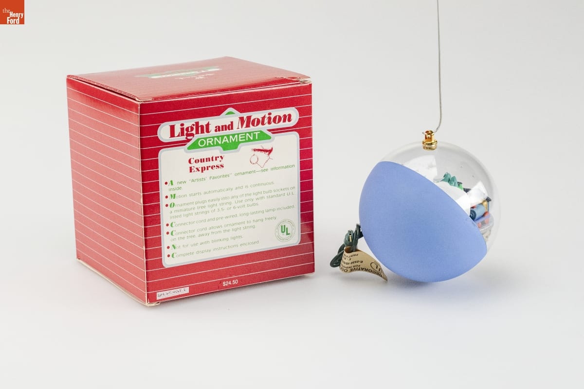 Light and Motion / ORNAMENT / Country / Express / A new "Artists' Favorites" ornament - see information / inside. / Motion starts automatically and is continuous. / Ornament plugs easily and quickly into any of the light bulb sockets on / a miniature tree light string. Use only with standard U.L. / llisted light strings of 3.5- or 6-volt bulbs. / Connector cord and pre-wired, long-lasting lamp included. / Connector cord allows ornament to hang freely / on the tree, away from the light string. / Not for use with blinking lights. / Complete display instructions enclosed.
