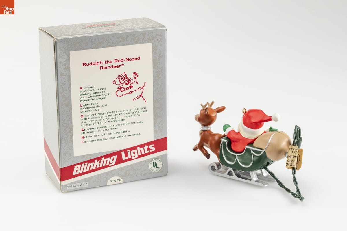 Rudolph the Red-Nosed / Reindeer [R] / A unique / ornament -- bright / blinking lights / fills your Christmas with / Keepsake Magic! / Lights blink / automatically and / continuously. / Ornament plugs easily into any of the light / bulb sockets on a miniature tree light string. / Use only with / standard U.L. listed light / strings of 3.5- or 6-volt bulbs. / Attached connector cord allows for easy / placement on your tree. / Not for use with blinking lights. / Complete display instructions enclosed. / Blinking Lights