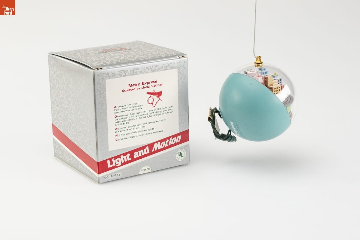 Metro Express / Sculpted by Linda Sickman / A unique "Artists' / Favorites" ornament -- / see information inside. / Ornament plugs easily into any of the light bulb / sockets on a miniature tree light string. Use only / with standard U.L. listed light strings of 3.5- or / 6- volt bulbs. / Attached connector cord allows for easy / placement on your tree. / Not for use with blinking lights. / Complete display instructions enclosed. / Light and Motion