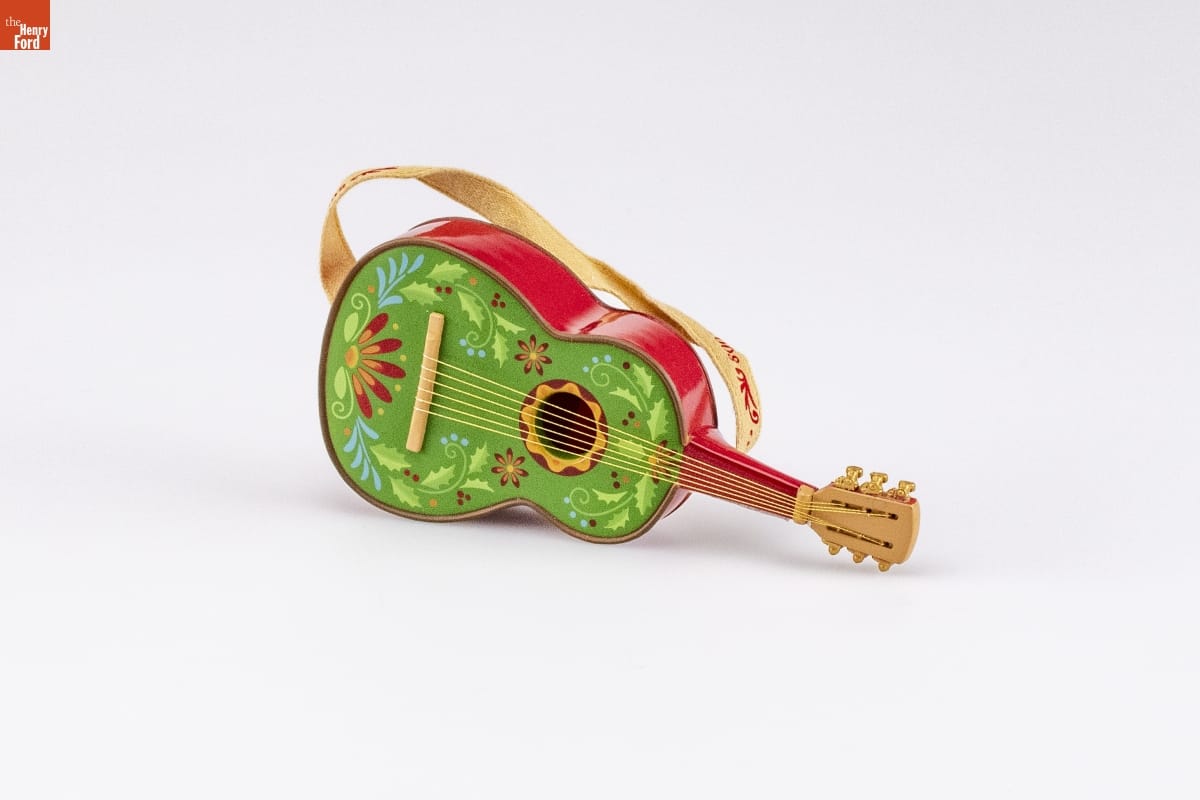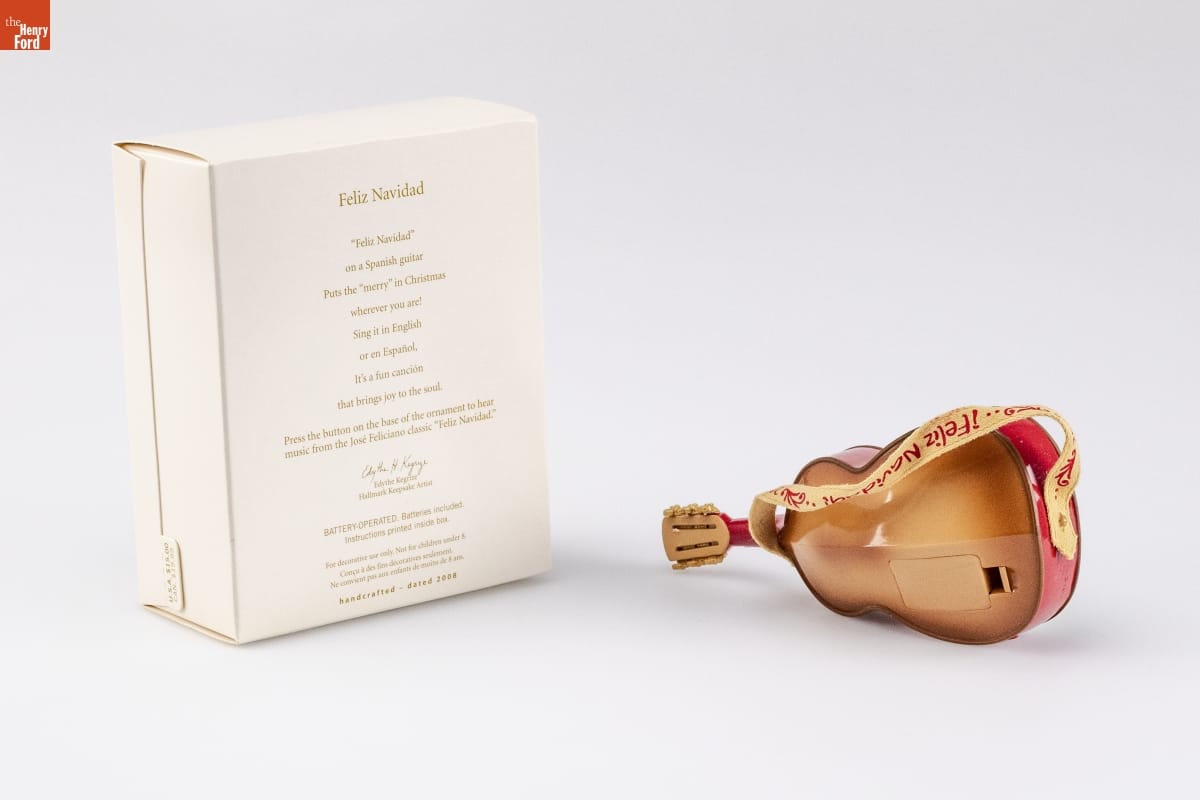 Feliz Navidad / "Feliz Navidad" / on a Spanish guitar / Puts the "merry" in Christmas / wherever you are! / Sing it in English / or en Espanol, / It's a fun cancion / that brings joy to the soul. / Press the button on the base of the ornament to hear / music from the Jose Feliciano classic "Feliz Navidad." / Edythe Kegrize / Hallmark Keepsake Artist / BATTERY-OPERATED. Batteries included. / Instructions printed inside box. / For decorative use only. Not for children under 8. / Concu a des fins decoratives seulement. / Ne convient pas aux enfants de moins de 8 ans. / handcrafted - dated 2008
