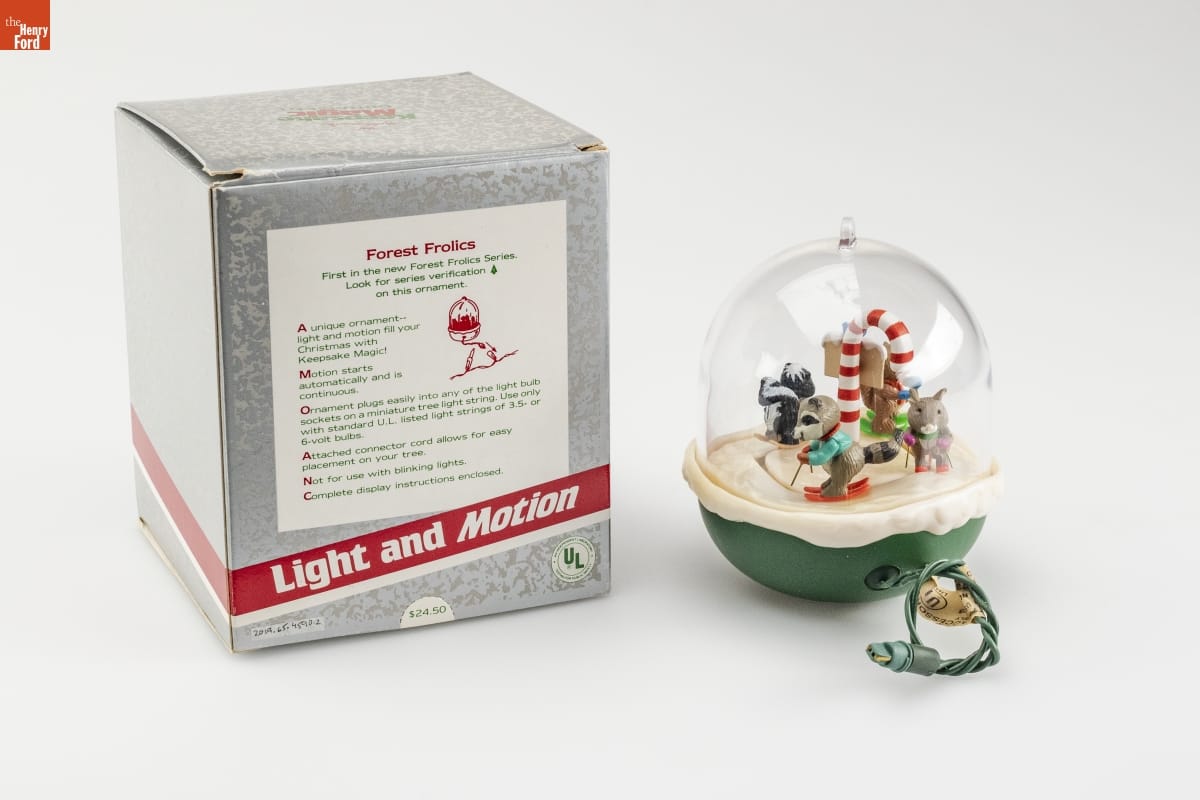Forest Frolics / First in the new Forest Frolics Series. / Look for series verification 1 / on this ornament. / A unique ornament -- / light and motion fill your / Christmas with / Keepsake Magic! / Motion starts / automatically and is / continuous. / Ornament plugs easily into any of the light bulb / sockets on a miniature tree light string. Use only / with standard U.L. listed light strings of 3.5- or / 6- volt bulbs. / Attached connector cord allows for easy / placement on your tree. / Not for use with blinking lights. / Complete display instructions enclosed. / Light and Motion