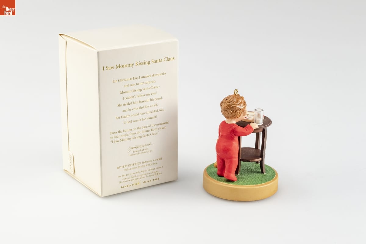 I Saw Mommy Kissing Santa Claus / On Christmas Eve, I sneaked downstairs / and saw, to my surprise, / Mommy kissing Santa Claus-- / I couldn't believe my eyes! / She tickled him beneath his beard, / and he chuckled like an elf. / Bet Daddy would have chuckled, too, / if he'd seen it for himself! / Press the button on the base of the ornament / to hear music from the Jimmy Boyd classic / "I Saw Mommy Kissing Santa Claus." / Joanne Eschrich / Hallmark Keepsake Artist / BATTERY-OPERATED. Batteries included. / Instructions printed inside box. / For decorative use only. Not for children under 8. / Concu a des fins decoratives seulement. / Ne convient pas aux enfants de moins de 8 ans. / handcrafted - dated 2008