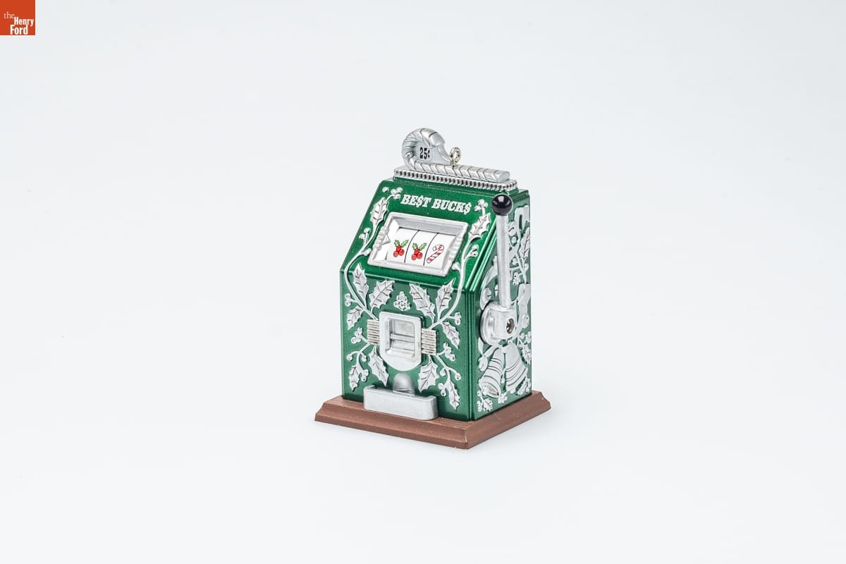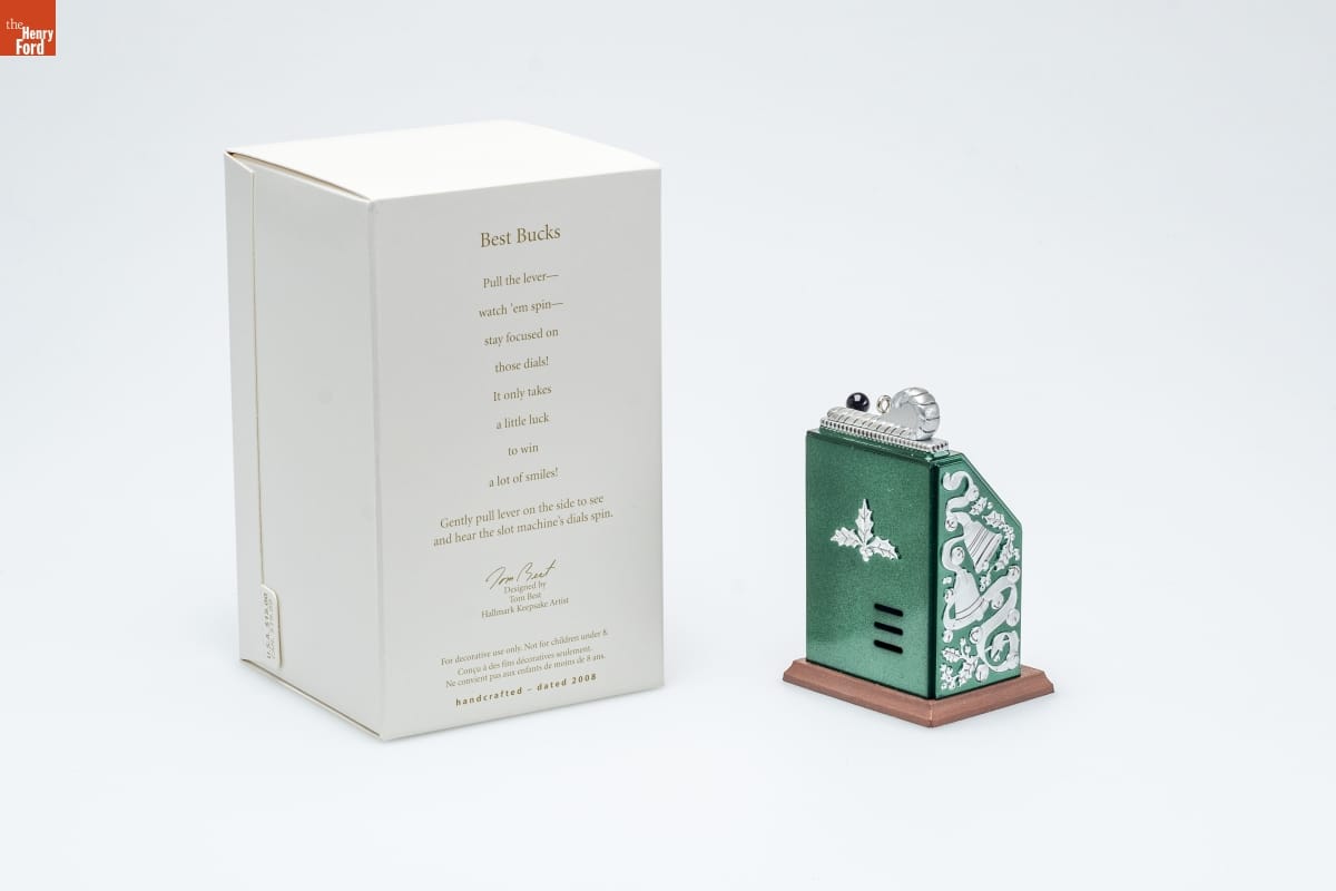 Best Bucks / Pull the lever-- / watch 'em spin-- / stay focused on / those dials! / It only takes / a little luck / to win / a lot of smiles! / Gently pull lever on the side to see / and hear the slot machine's dials spin. / Designed by / Tom Best / Hallmark Keepsake Artist / For decorative use only. Not for children under 8. / Concu a des fins decoratives seulement. / Ne convient pas aux enfants de moins de 8 ans. / handcrafted - dated 2008
