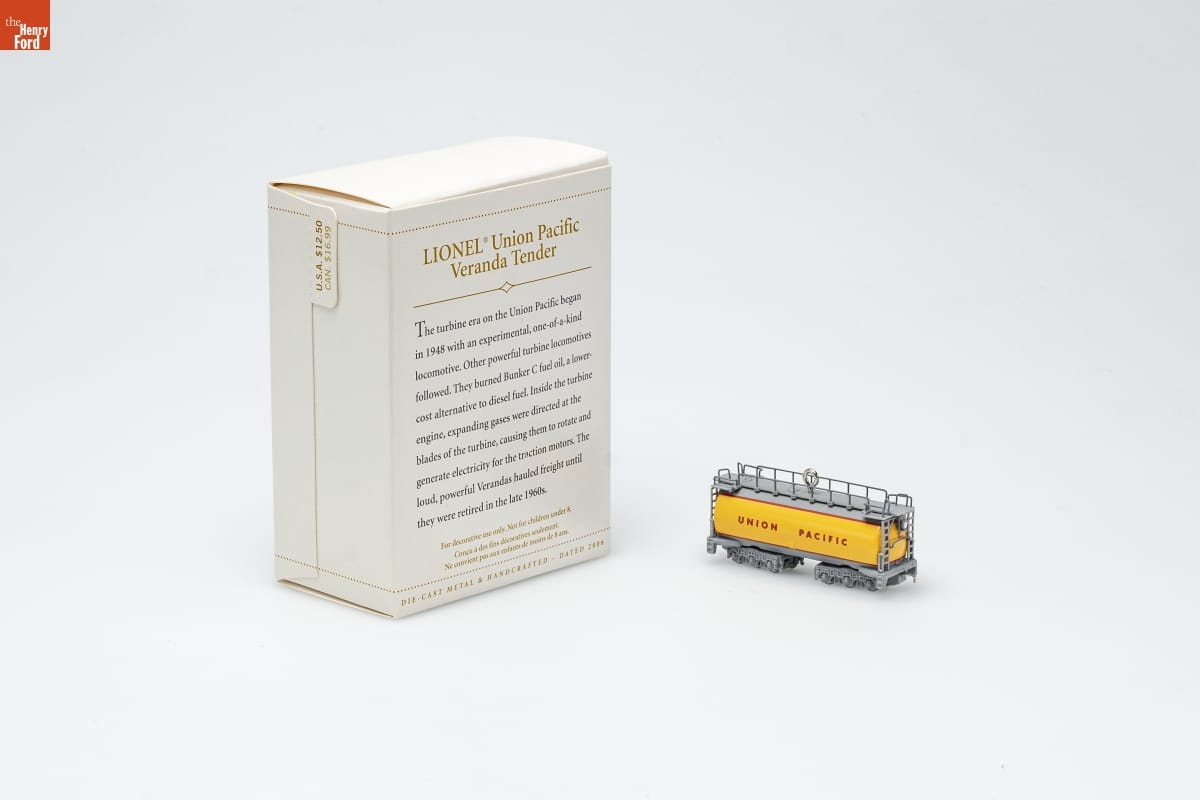 LIONEL (R) Union Pacific / Veranda Tender / The turbine era on the Union Pacific began / in 1948 with an experimental, one-of-a-kind / locomotive. Other powerful turbine locomotives / followed. They burned Bunker C fuel oil, a lower- / cost alternative to diesel fuel. Inside the turbine / engine, expanding gases were directed at the / blades of the turbine, causing them to rotate and / generate electricity for the traction motors. The / loud, powerful Verandas hauled freight until / they were retired in the late 1960s. / For decorative use only. Not for children under 8. / Concu a des fins decoratives seulement. / Ne convient pas aux enfants de moins de 8 ans. / DIE-CAST METAL & HANDCRAFTED - DATED 2006