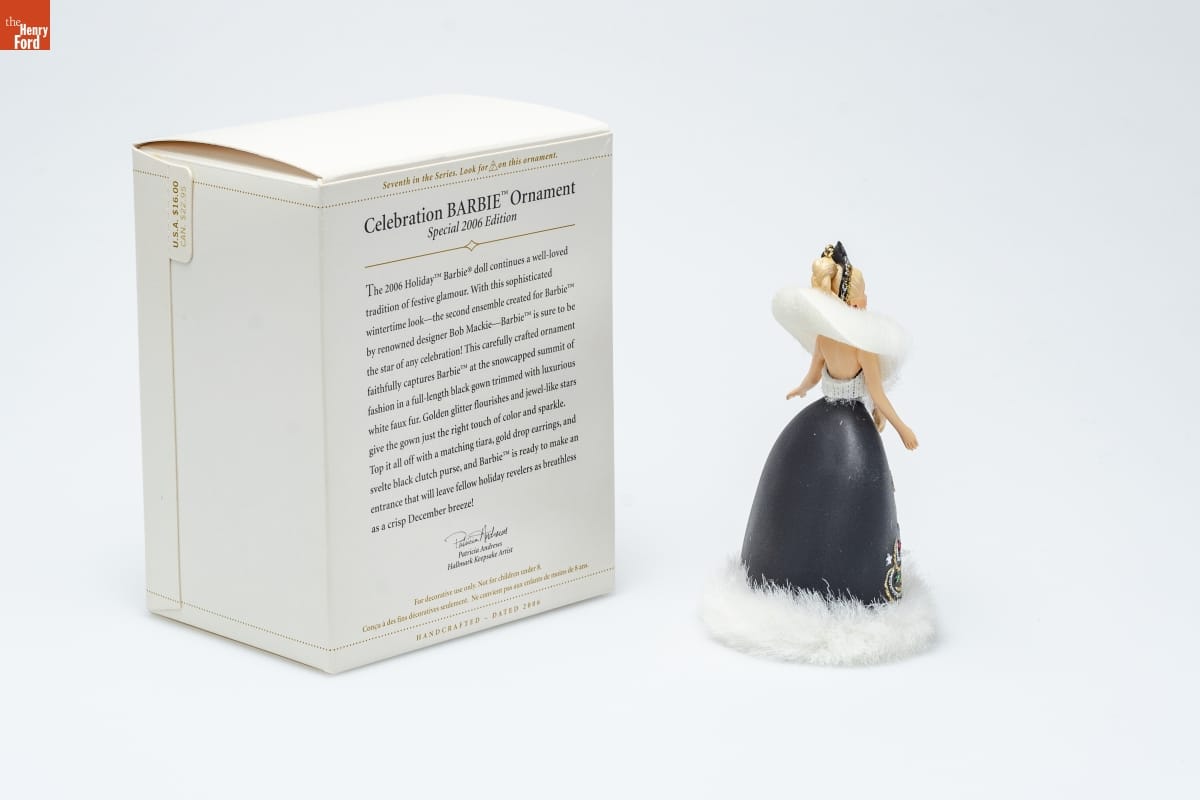 Seventh in the Series. Look for 7 on this ornament. / Celebration BARBIE TM Ornament / Special 2006 Edition / The 2006 Holiday TM Barbie (R) doll continues a well-loved / tradition of festive glamour. With this sophisticated / wintertime look--the second ensemble created for Barbie TM / by renowned designer Bob Mackie--Barbie TM is sure to be / the star of any celebration! This carefully crafted ornament / faithfully captures Barbie TM at the snowcapped summit of / fashion in full-length black gown trimmed with luxurious / white faux fur. Golden glitter flourishes and jewel-like stars / give the gown just the right touch of color and sparkle. / Top it all off with a matching tiara, gold drop earrings, and / svelte black clutch purse, and Barbie TM is ready to make an / entrance that will leave fellow holiday revelers as breathless / as a crisp December breeze! / Patricia Andrews / Hallmark Keepsake Artist / For decorative use only. Not for children under 8. / Concu a des fins decoratives seulement. Ne convient pas aux enfants de moins de 8 ans. / HANDCRATED - DATED 2006