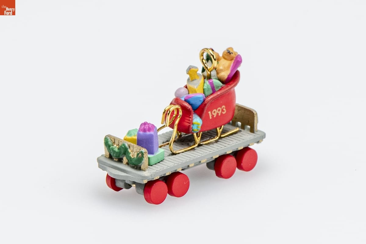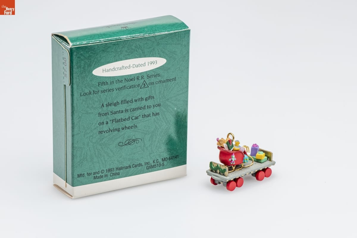 Handcrafted - Dated 1993 / Fifth in the Noel R.R. Series. / Look for series verification 5 on ornament. / A sleigh filled with gifts / from Santa is carried to you / on a "Flatbed Car" that has / revolving wheels. / Mfd. for and (C) 1993 Hallmark Cards, Inc., K.C., MO 64141 / Made in China QXM510-5