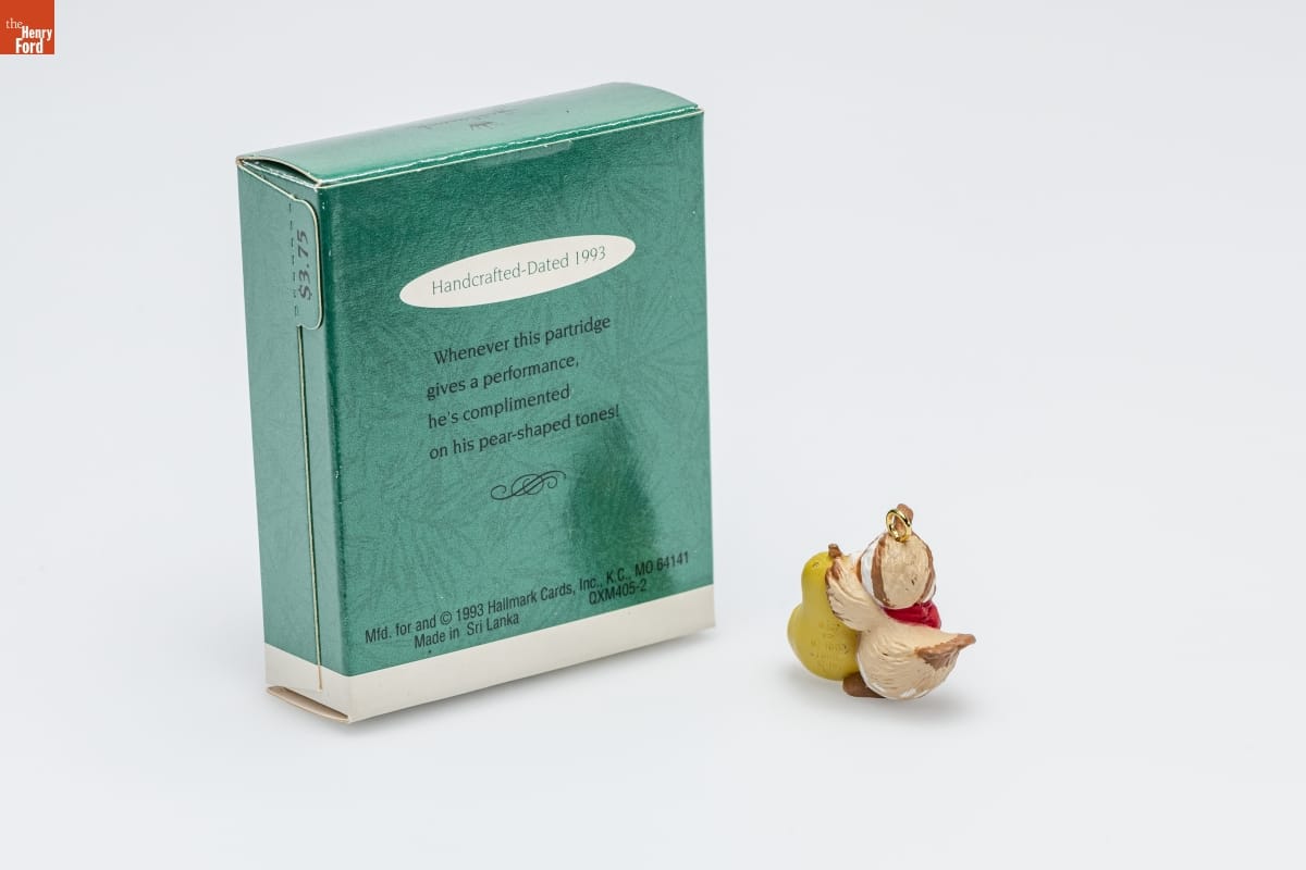 Handcrafted - Dated 1993 / Whenever this partridge / gives a performance, / he's complimented / on his pear-shaped tones! / Mfd. for and (C) 1993 Hallmark Cards, Inc., K.C., MO 64141 / Made in Sri Lanka QXM405-2