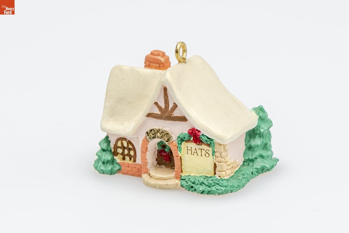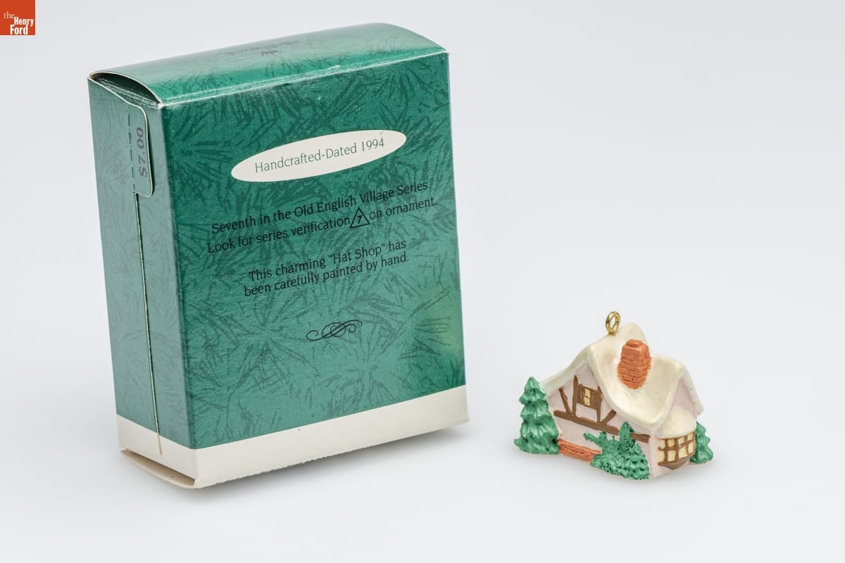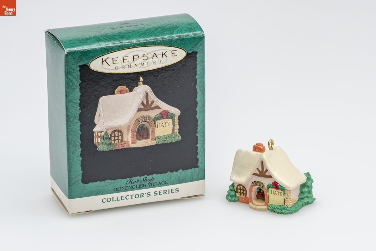 Handcrafted - Dated 1994 / Seventh in the Old English Village Series. / Look for series verification 7 on ornament. / This charming "Hat Shop" has / been carefully painted by hand.