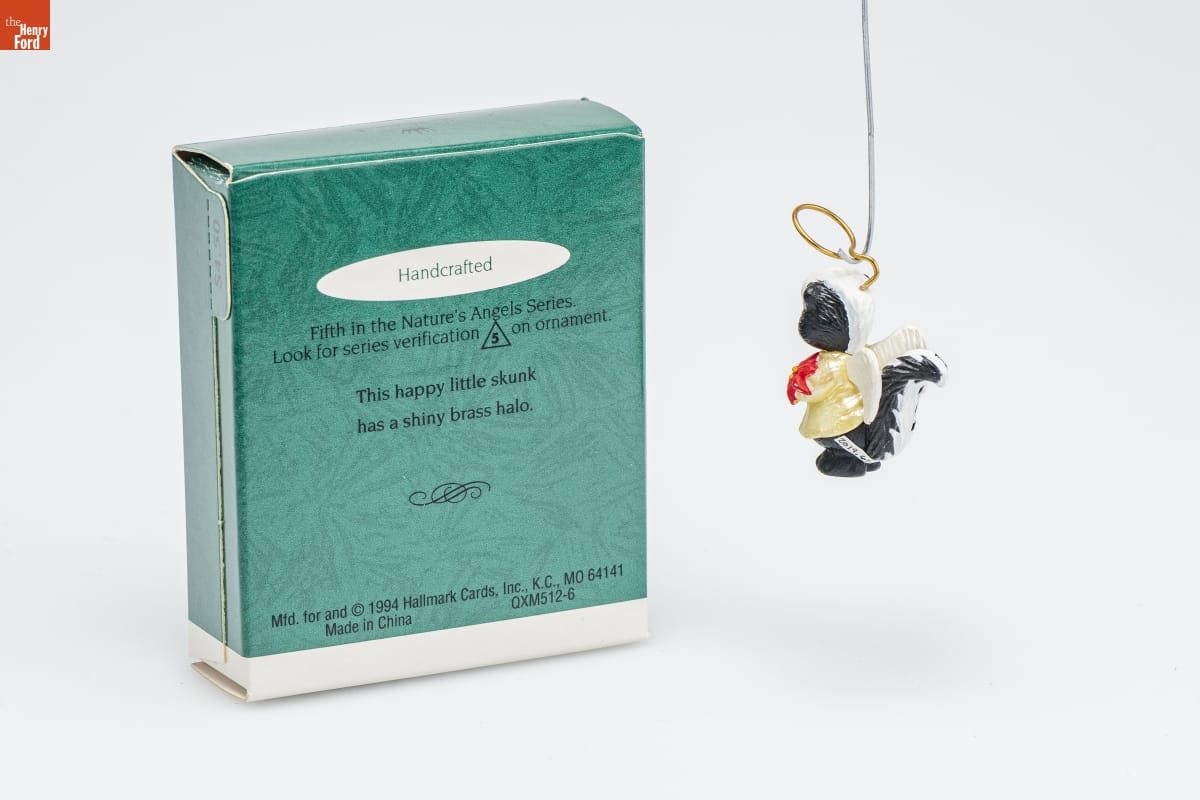 Handcrafted / Fifth in the Nature's Angels Series. / Look for series verification 5 on ornament. / This happy little skunk / has a shiny brass halo. / Mfd. for and (C) 1994 Hallmark Cards, Inc., K.C., MO 64141 / Made in China QXM512-6
